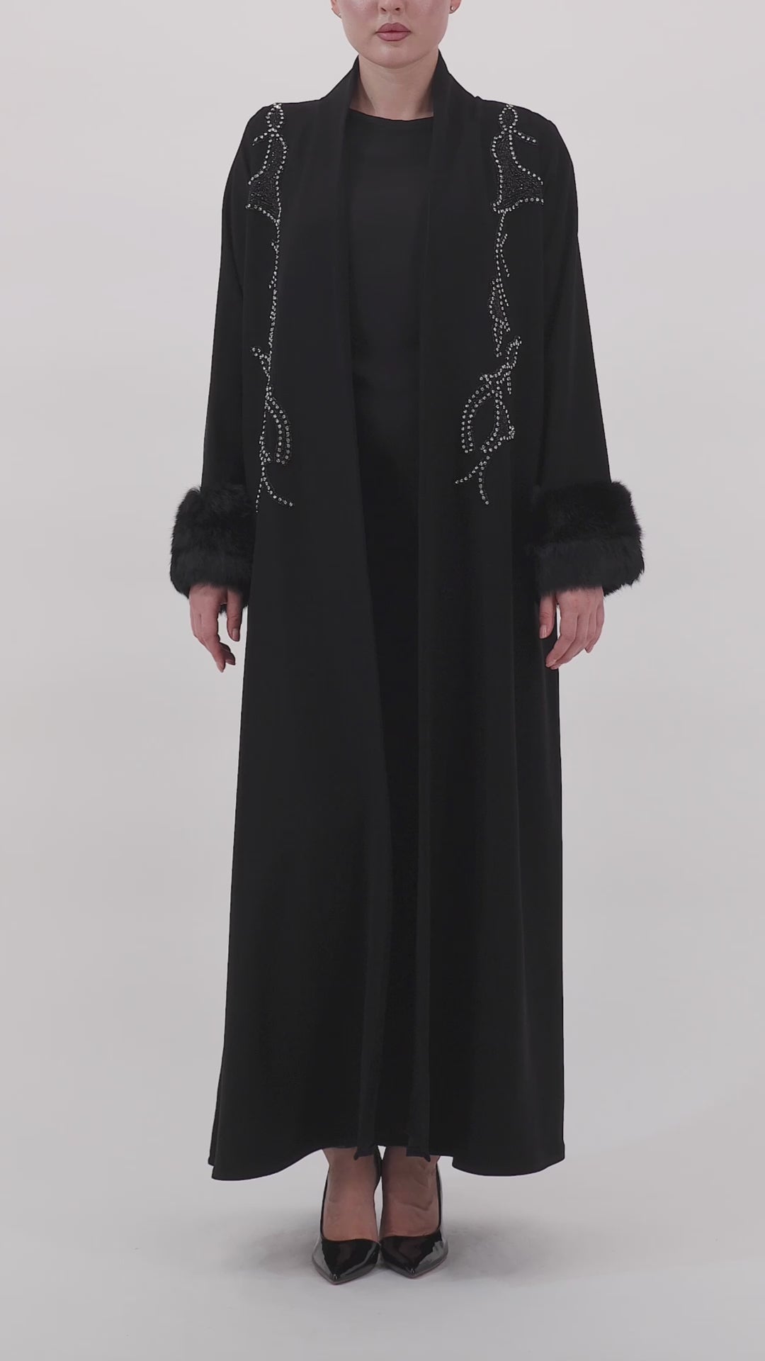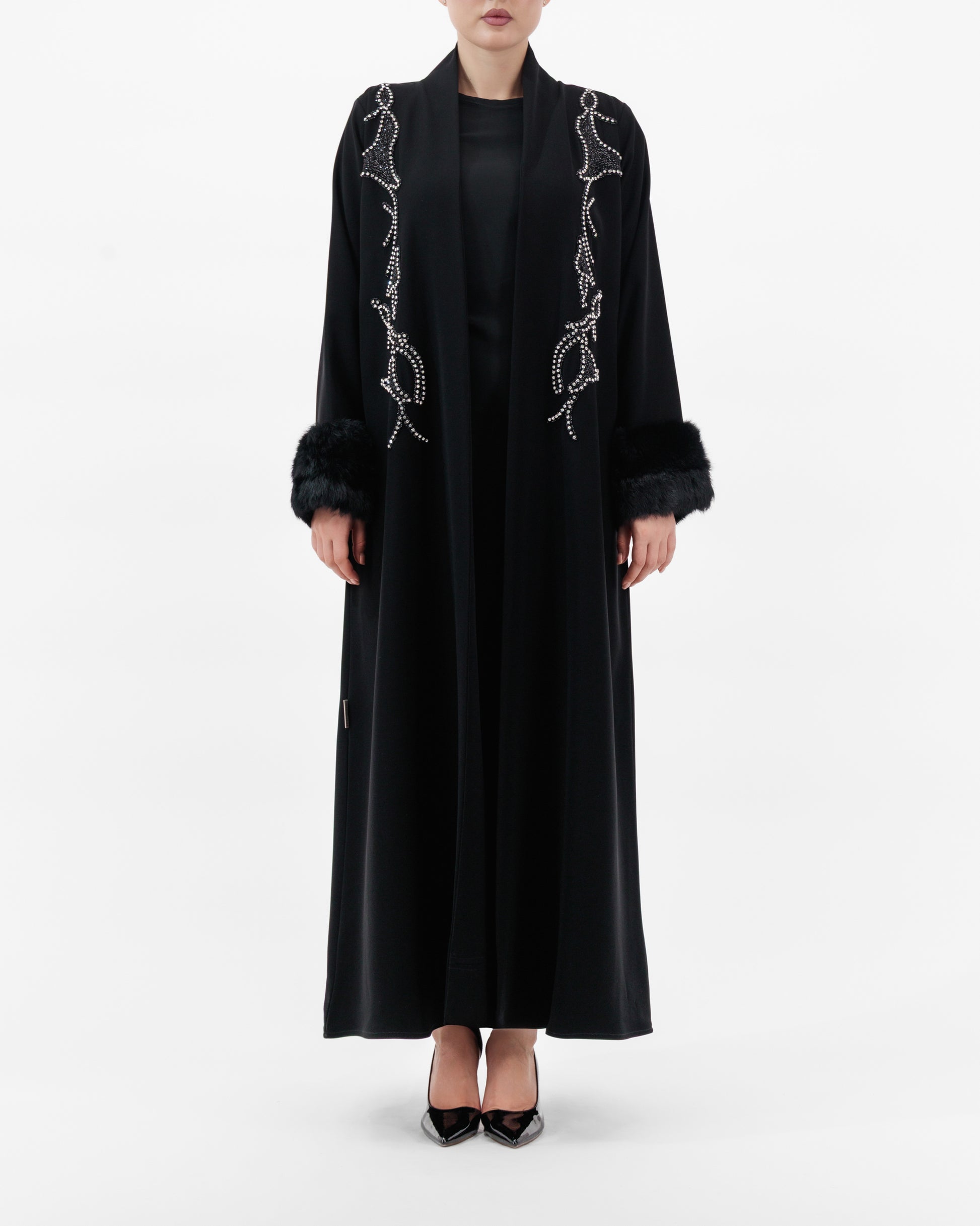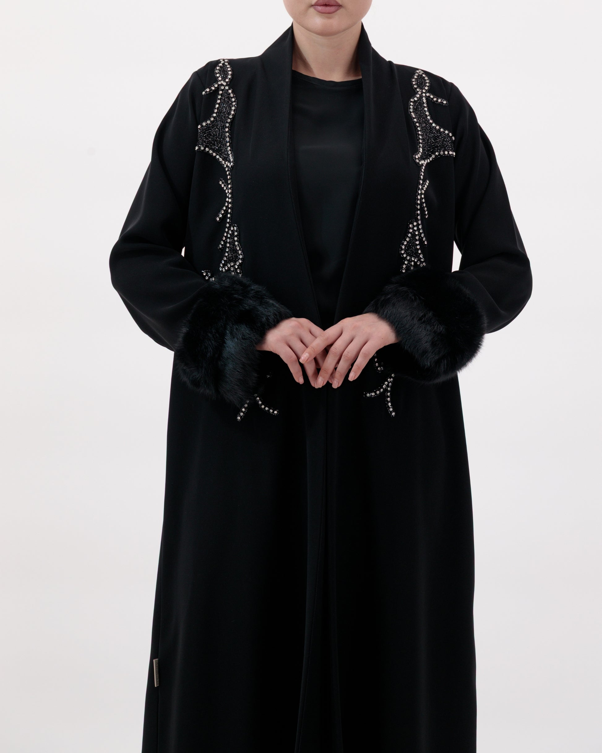 Crafted from luxurious Italian crepe, this abaya is elevated with hand-applied beadwork along the front for a shimmering touch of elegance. The plush fur-trimmed cuffs add a modern, glamorous finish—perfect for evening wear and special occasions.