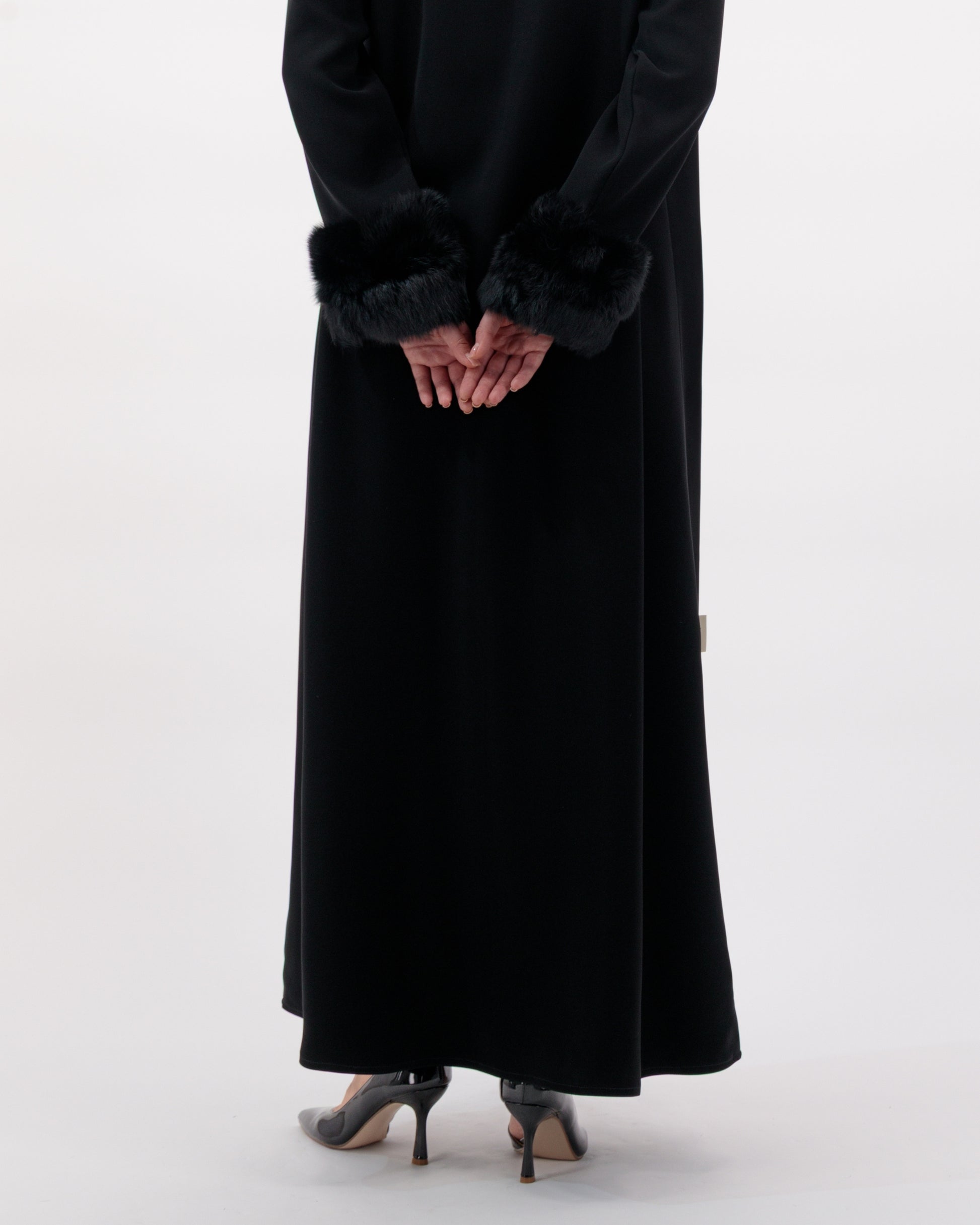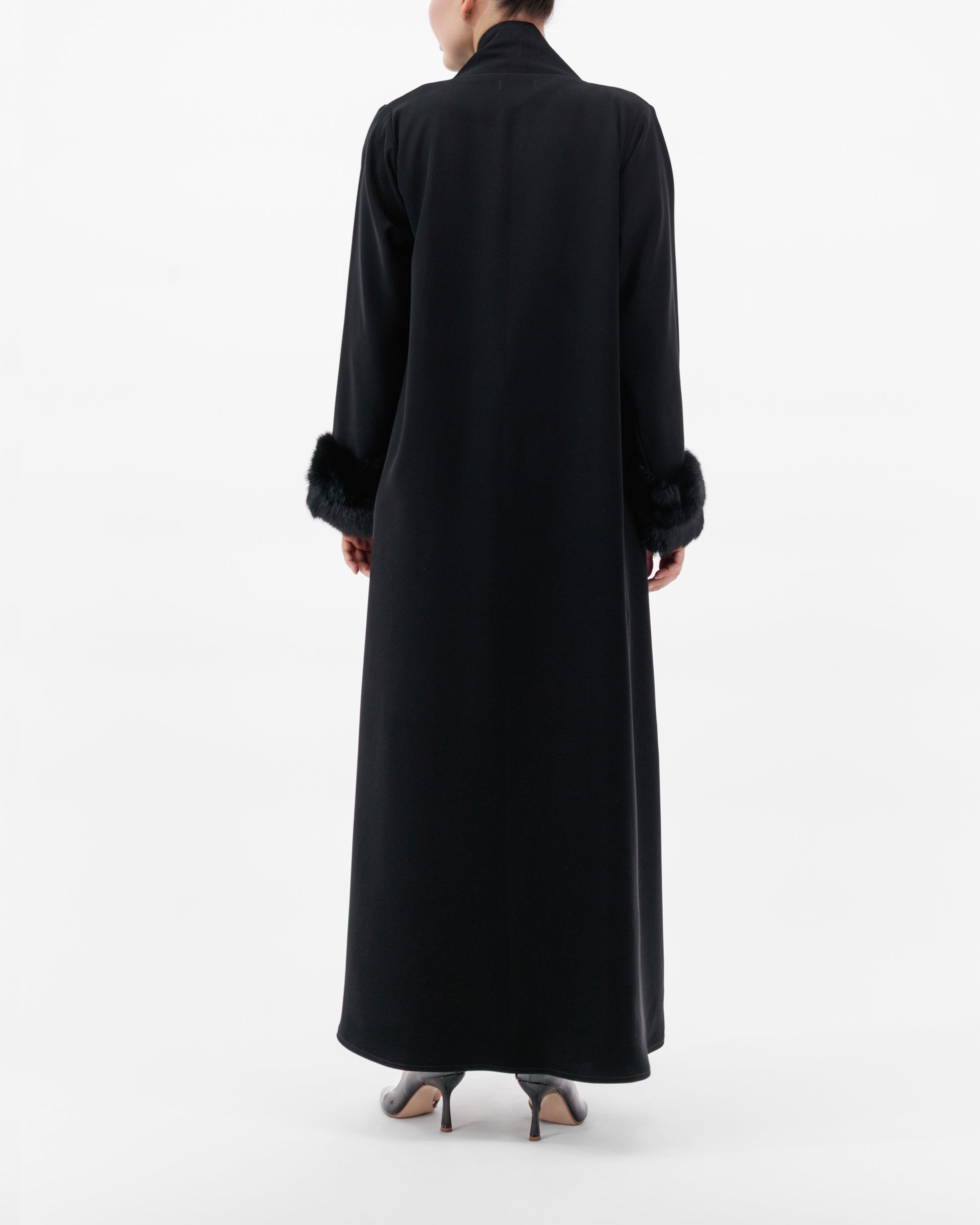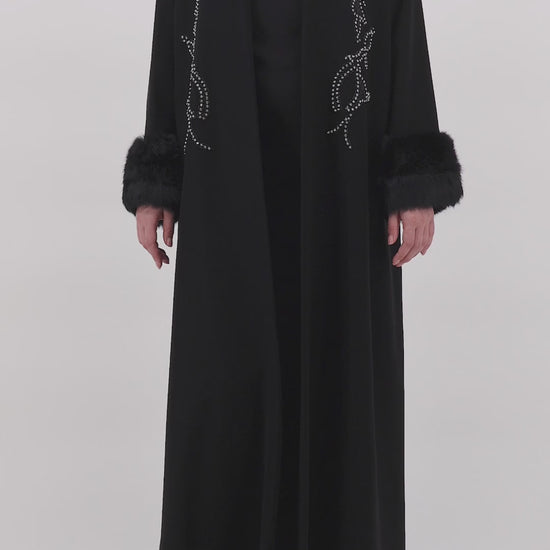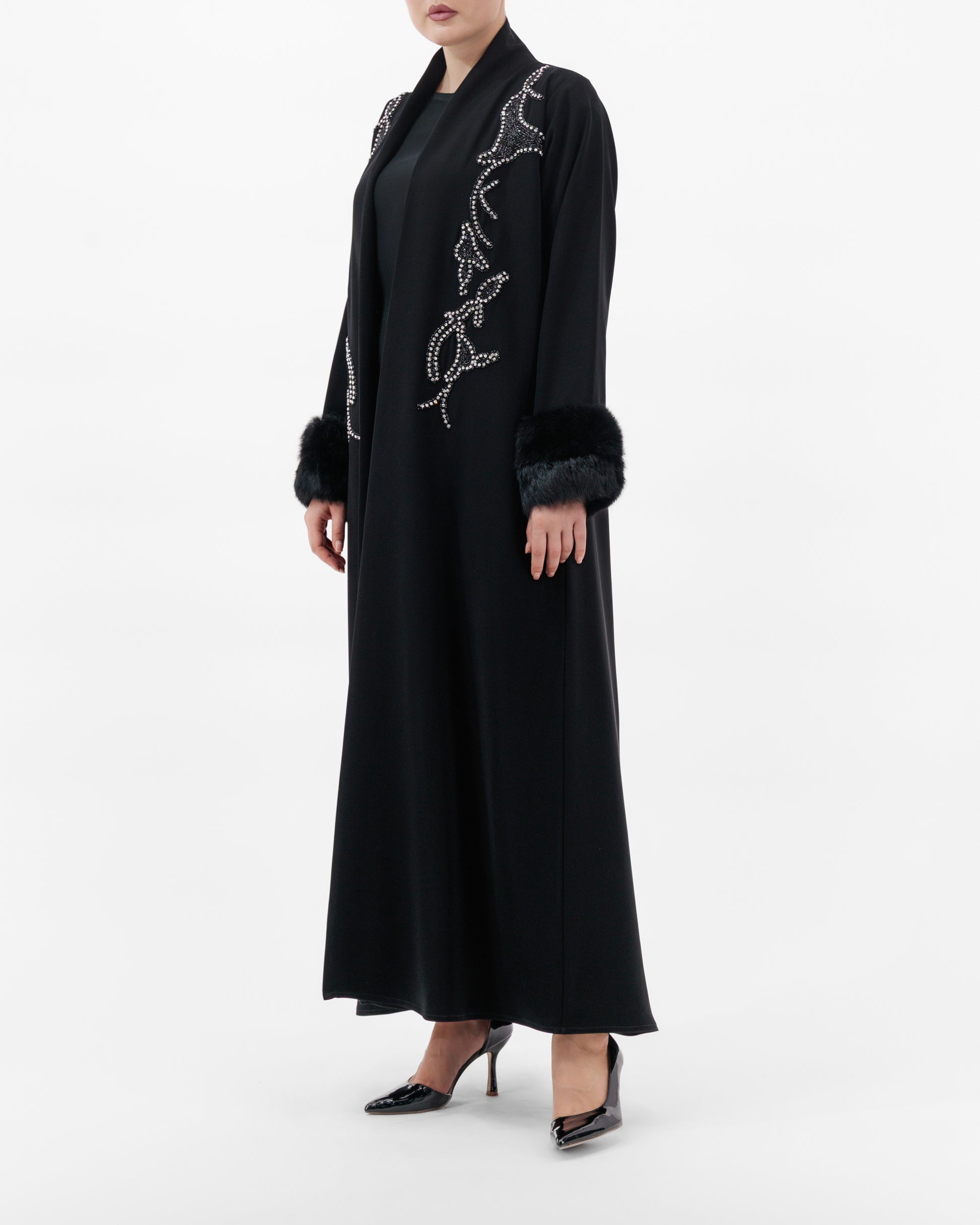 Crafted from luxurious Italian crepe, this abaya is elevated with hand-applied beadwork along the front for a shimmering touch of elegance. The plush fur-trimmed cuffs add a modern, glamorous finish—perfect for evening wear and special occasions.