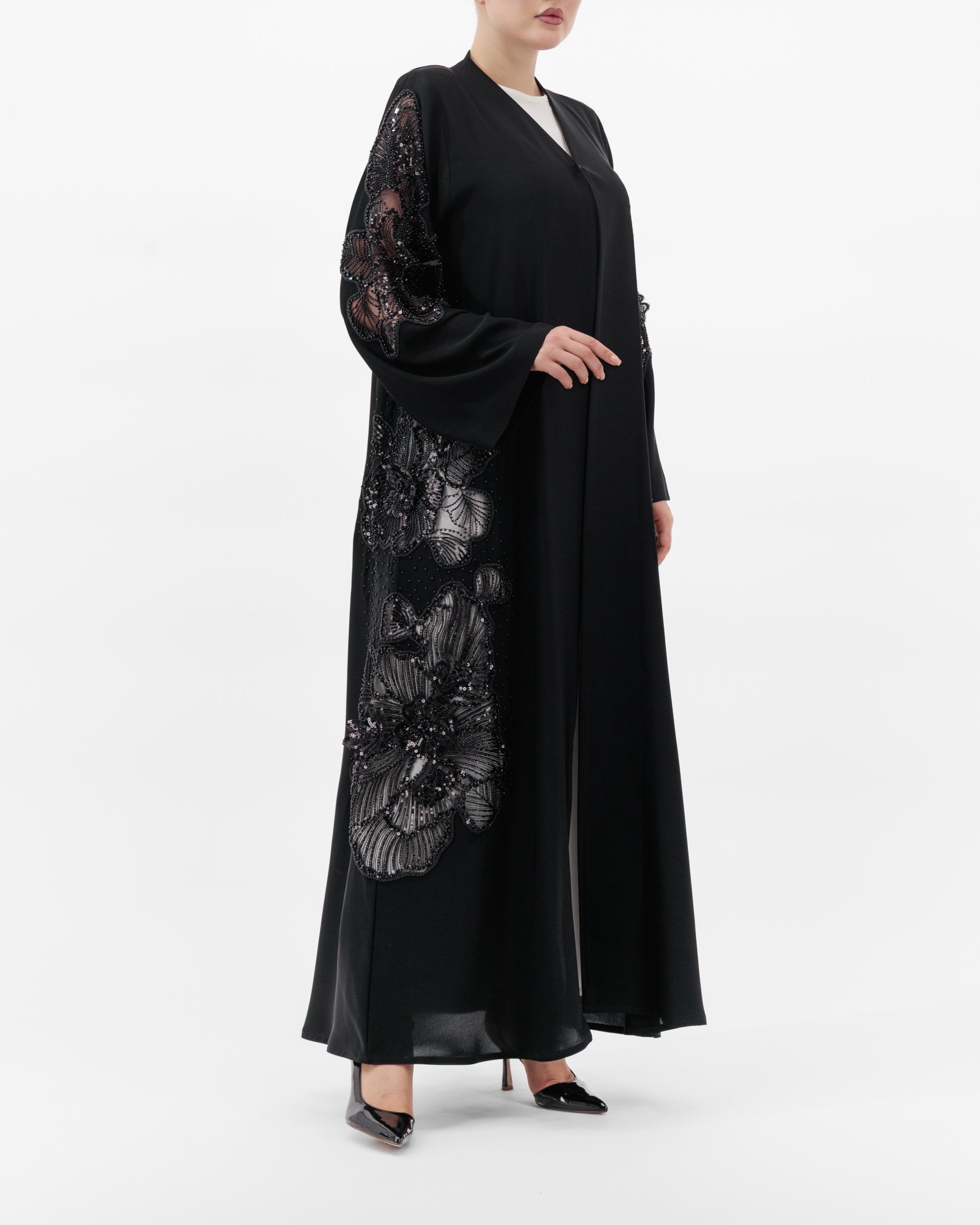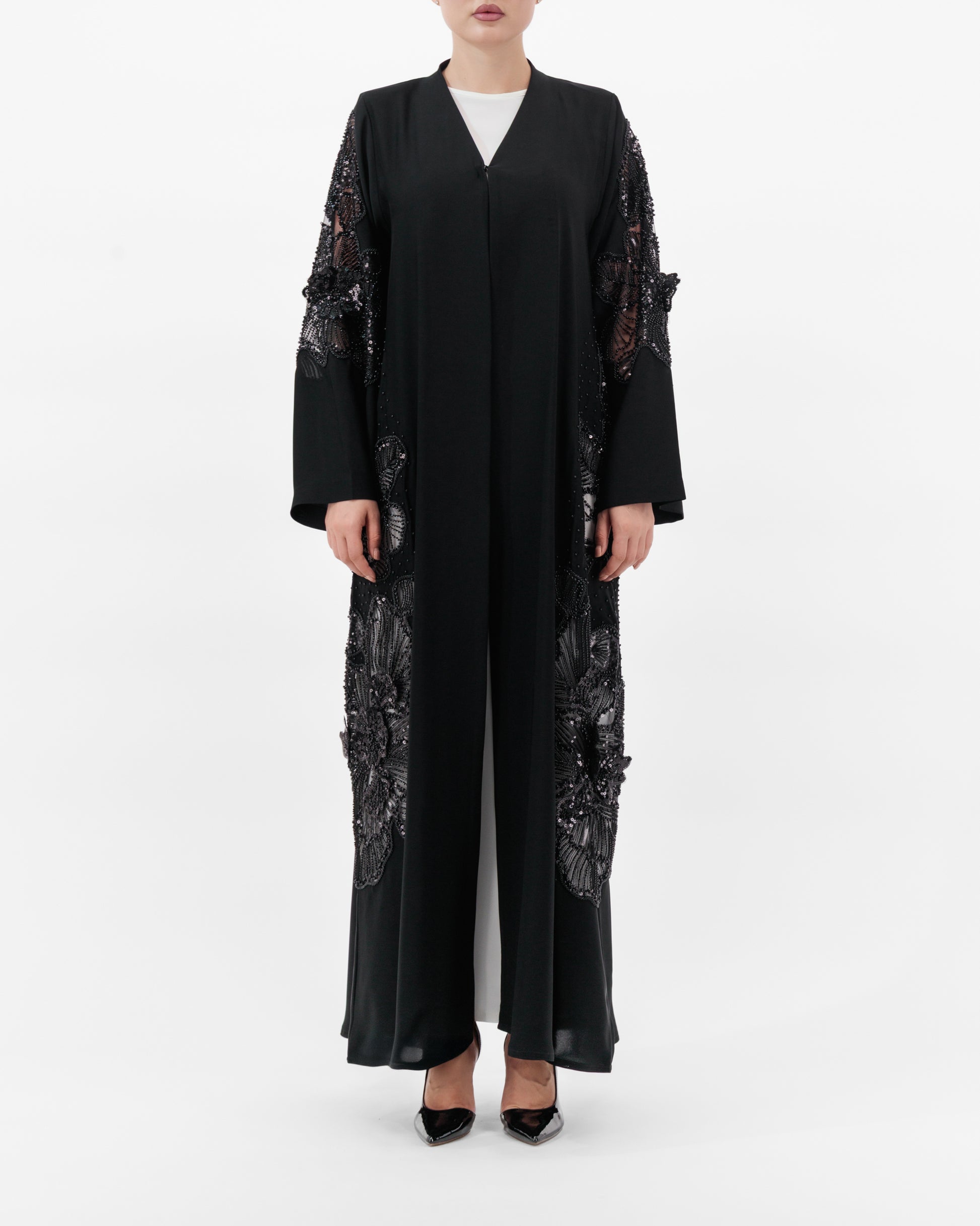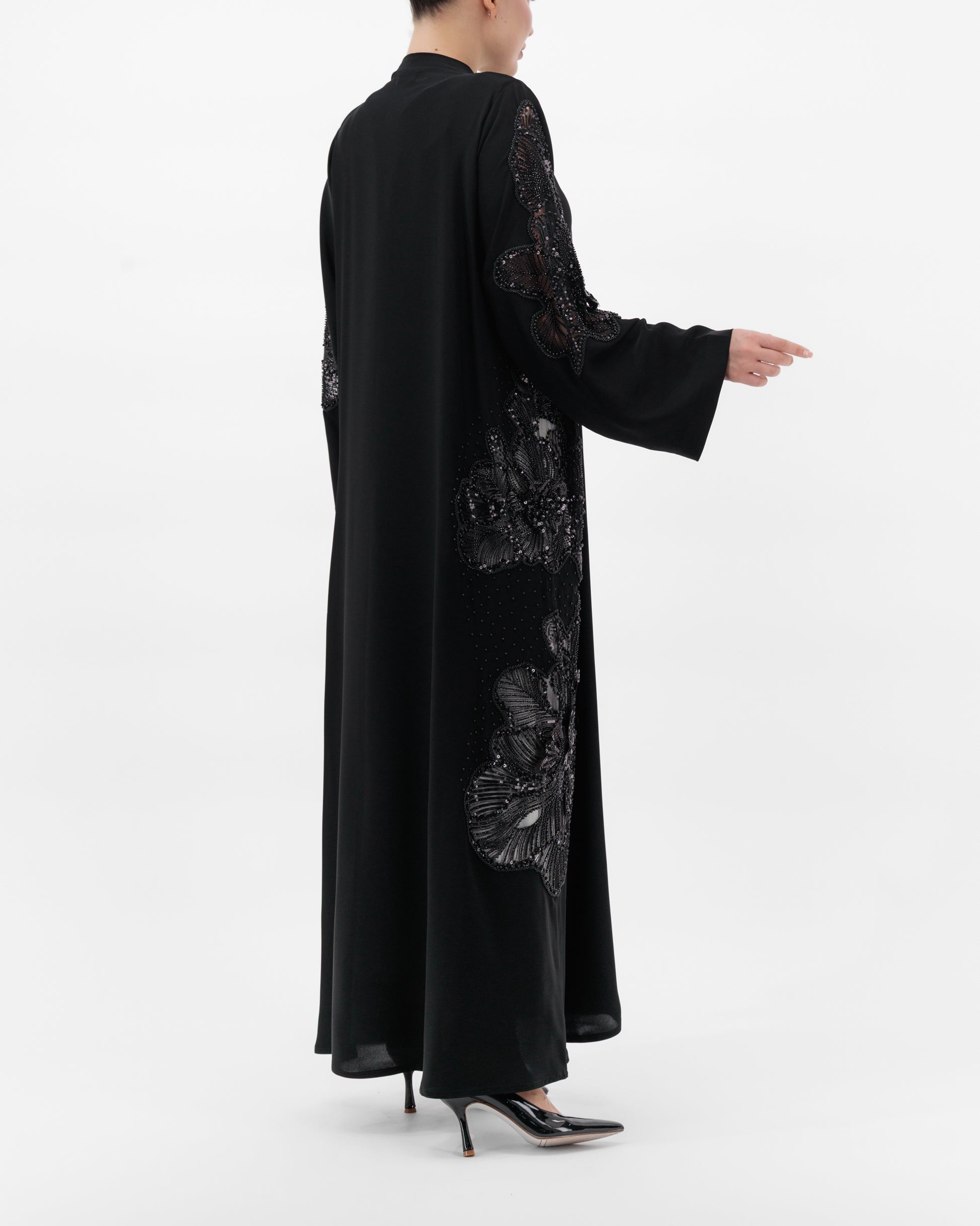 Crafted from luxurious Italian crepe, this timeless black abaya is elevated with intricate hand embellishments along the sleeves and lower panels. Each floral motif is delicately beaded and embroidered to create a dimensional play of texture and light, perfect for evening gatherings and special occasions. The fluid drape and understated silhouette bring a graceful balance between sophistication and allure, making it an enduring statement of refined elegance.