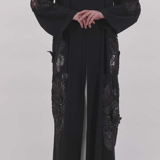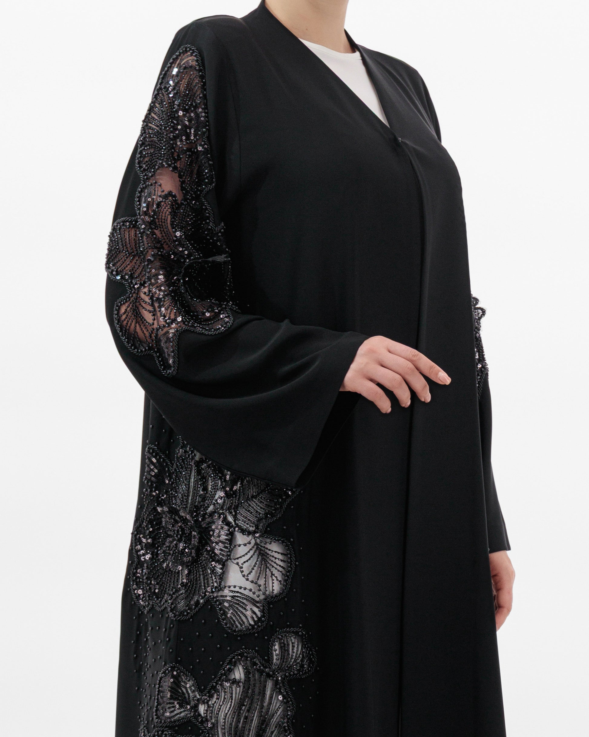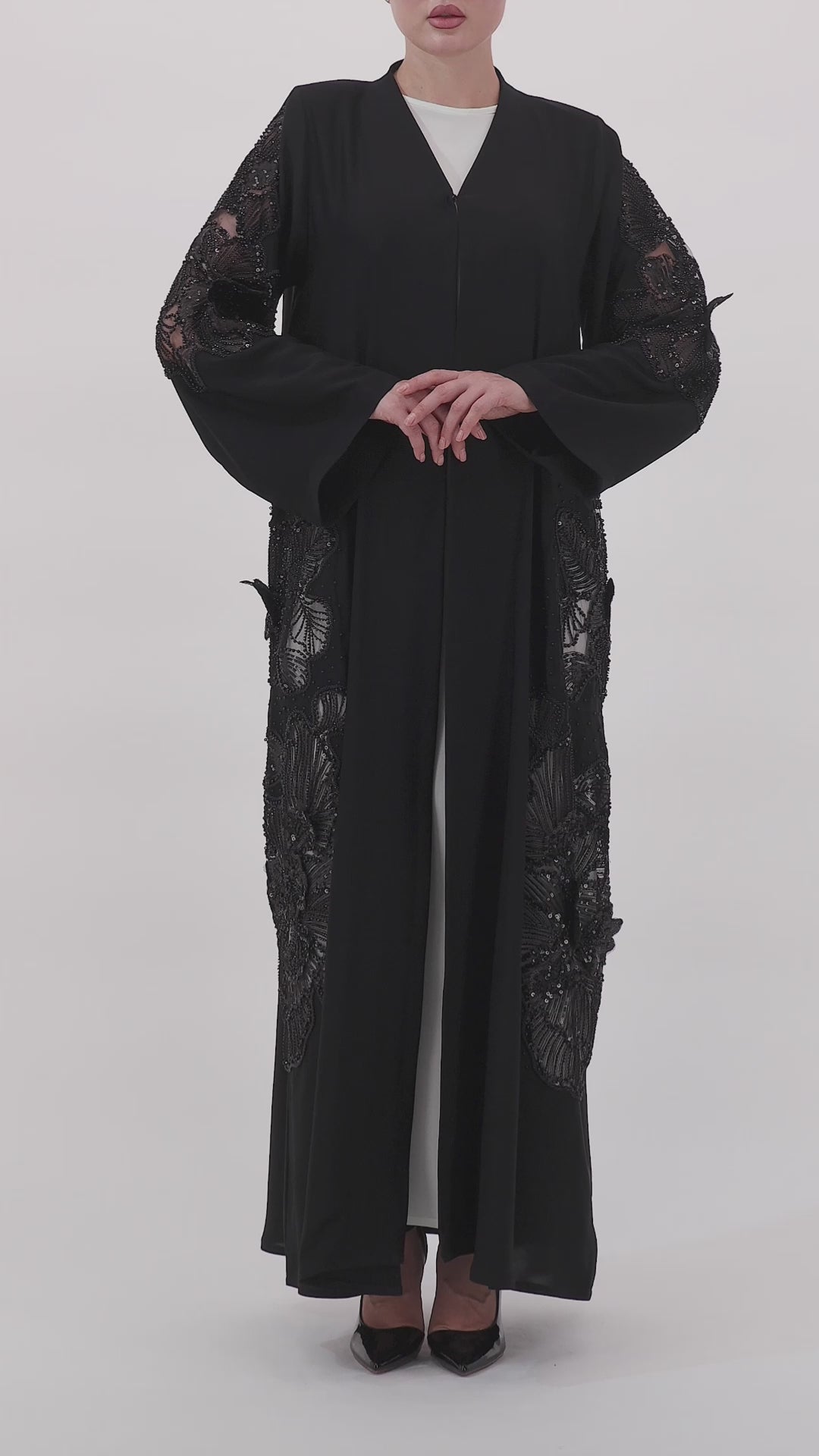 Crafted from luxurious Italian crepe, this timeless black abaya is elevated with intricate hand embellishments along the sleeves and lower panels. Each floral motif is delicately beaded and embroidered to create a dimensional play of texture and light, perfect for evening gatherings and special occasions. The fluid drape and understated silhouette bring a graceful balance between sophistication and allure, making it an enduring statement of refined elegance.