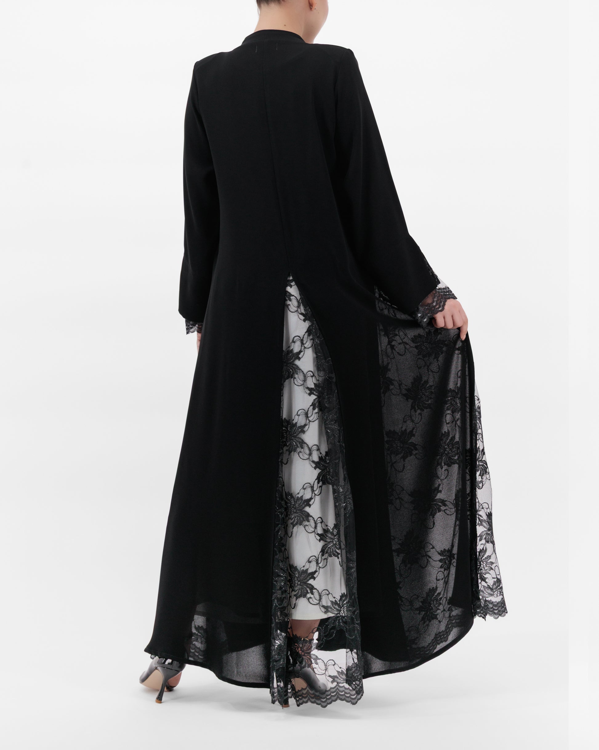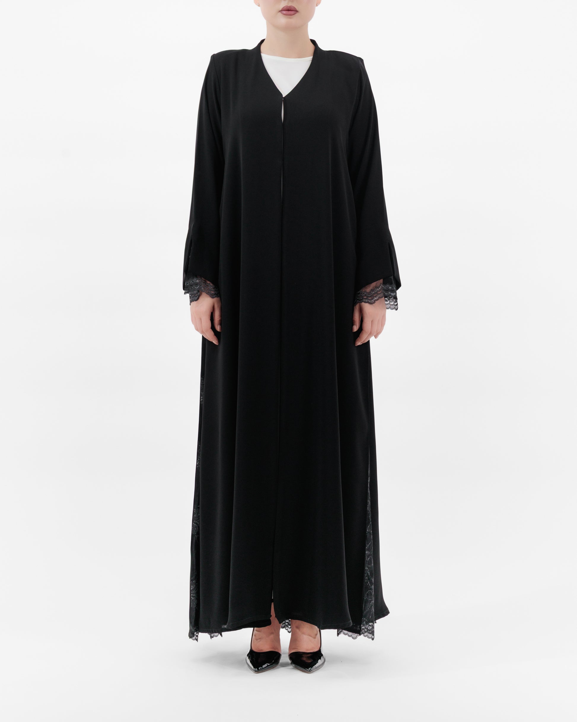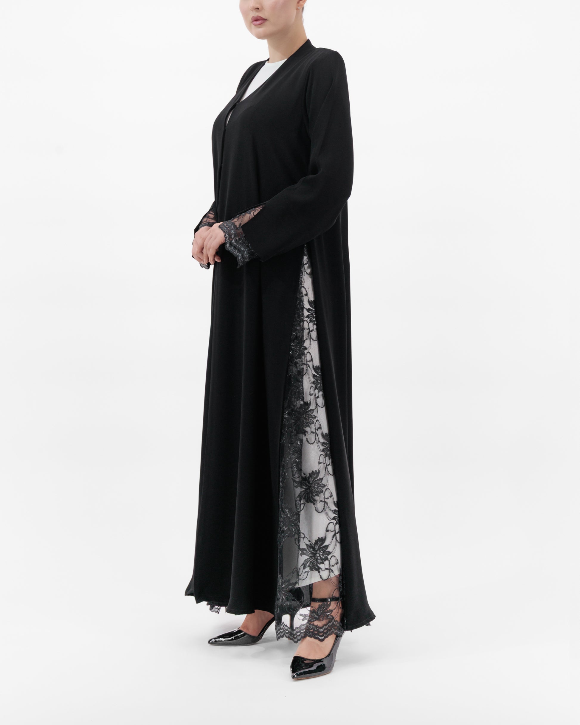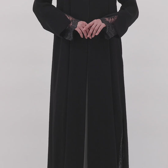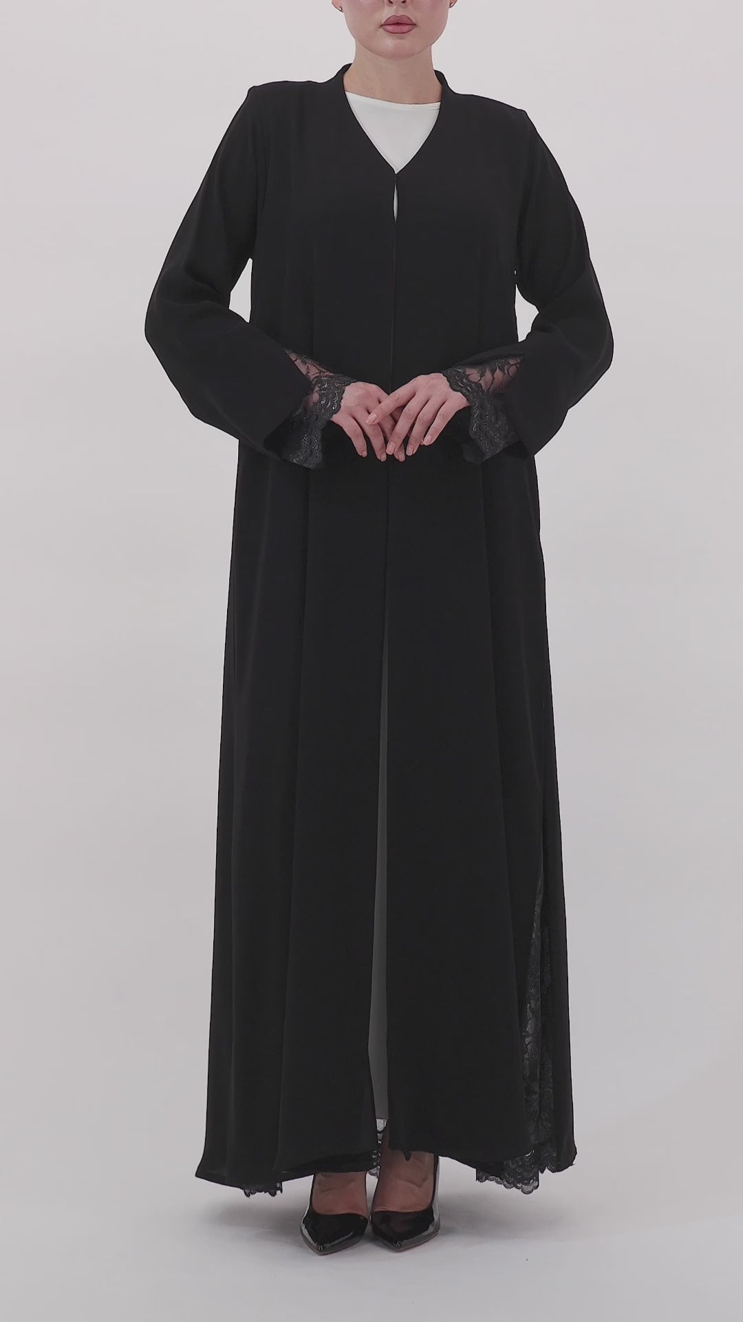 Crafted in luxurious Italian crepe with a flowing shiny lace underlay, this abaya is designed to embody timeless grace and modern sophistication. The lace cuffs and dramatic back slit reveal elegance in motion, making it a statement of refined femininity and effortless allure.