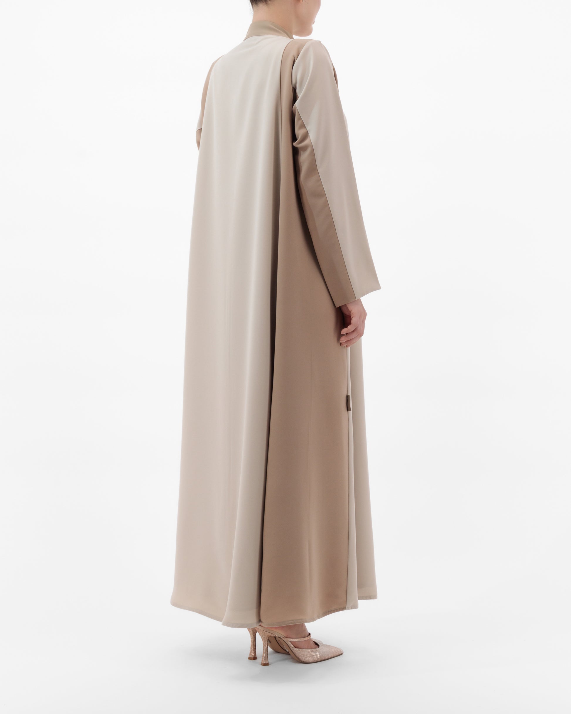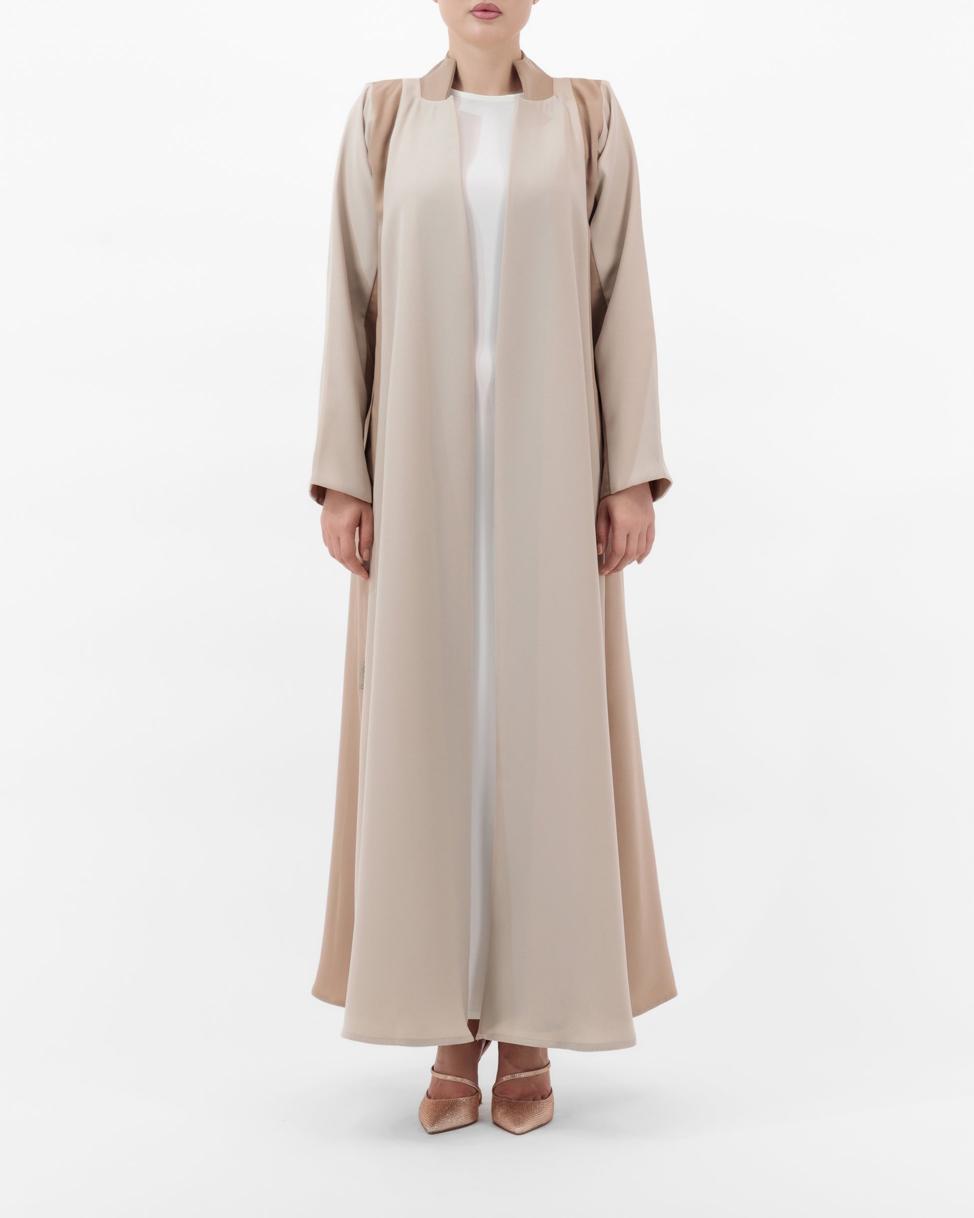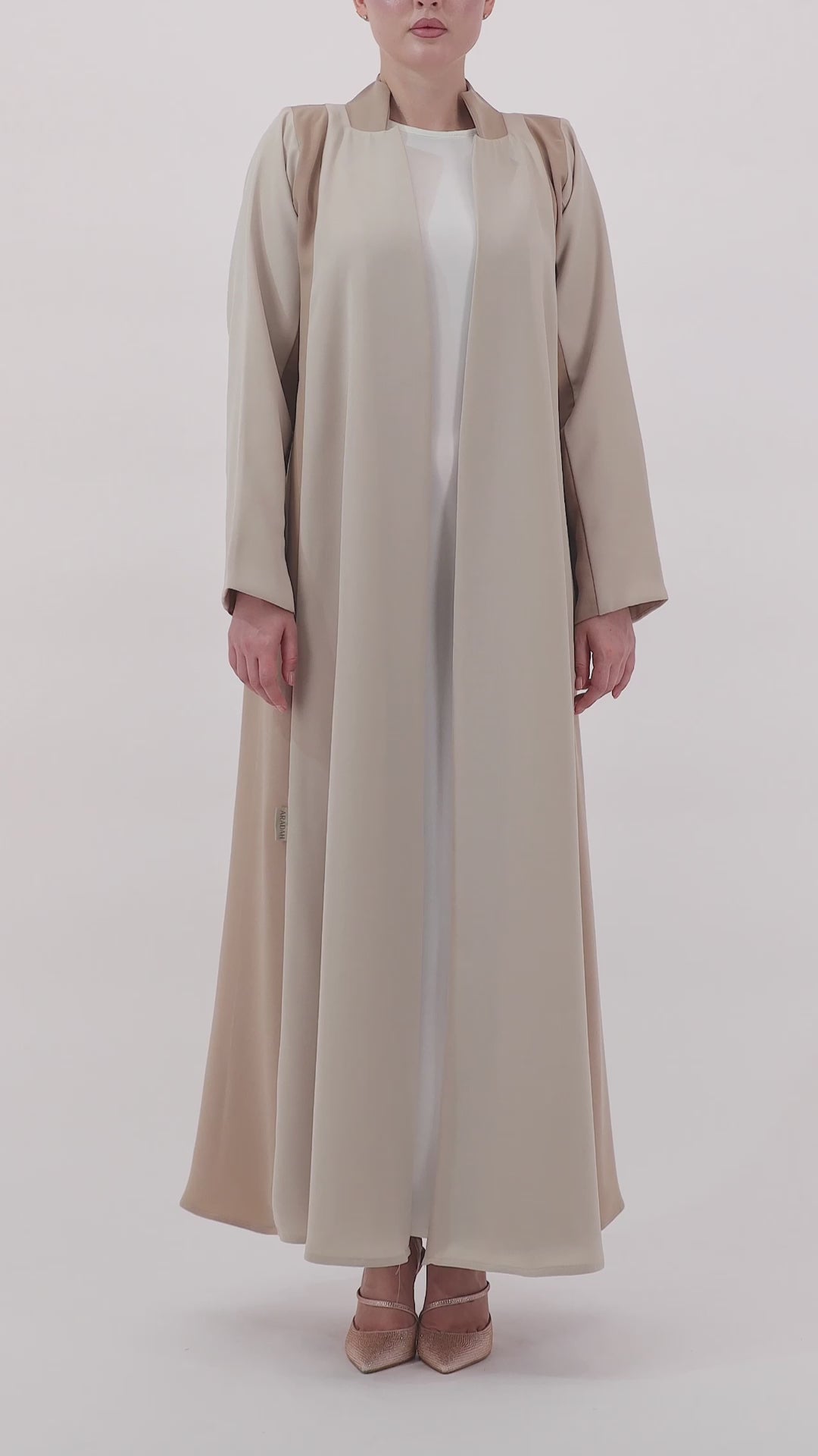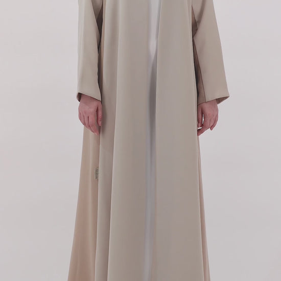 Crafted from premium Italian crepe in soft beige tones, this abaya blends timeless simplicity with modern sophistication. Lightweight, flowy, and effortlessly chic—perfect for everyday elegance.