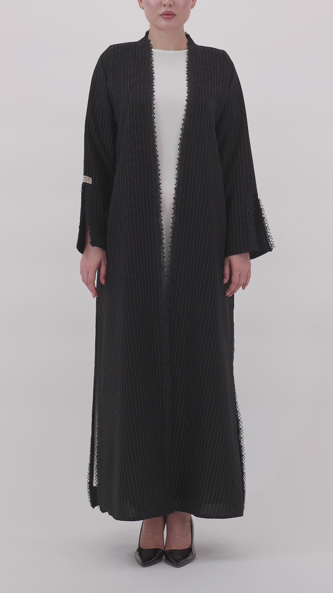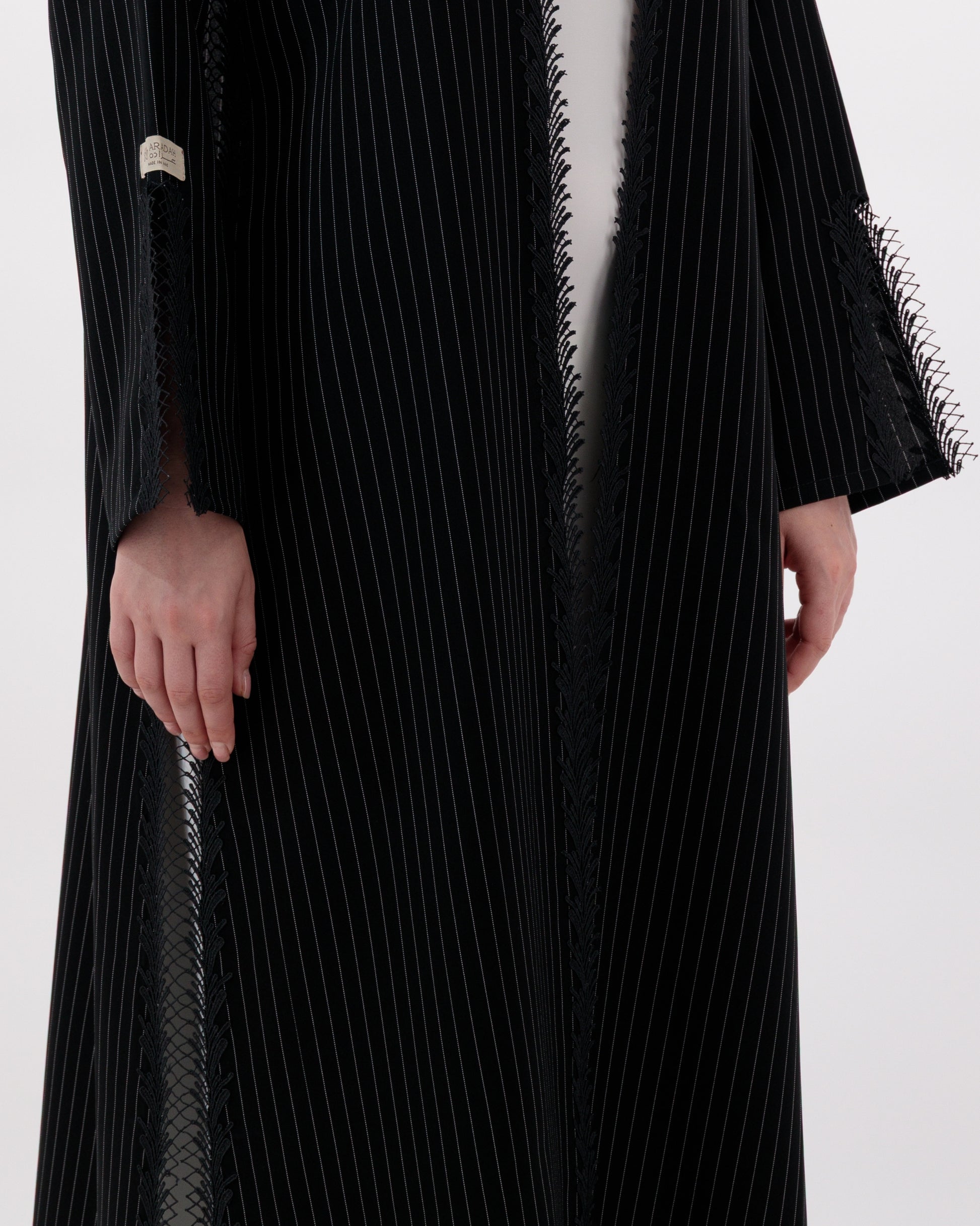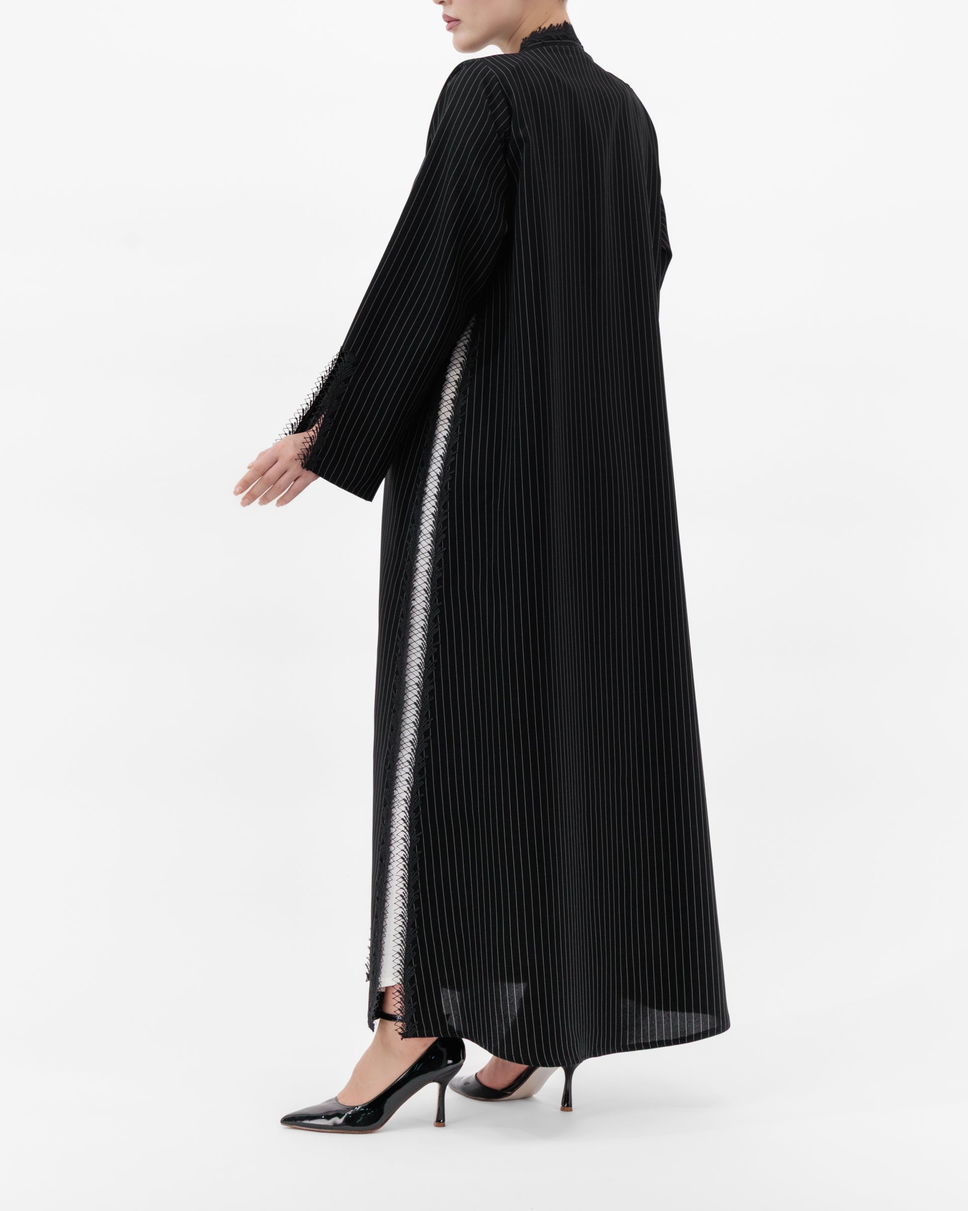 This design, named in honor of one of our cherished clients, is our way of celebrating timeless elegance and showing love through craftsmanship. Tailored in premium Italian crepe with fine pinstripes and finished with delicate lace-trim detailing, it reflects sophistication that every woman deserves to experience.
