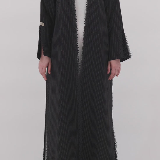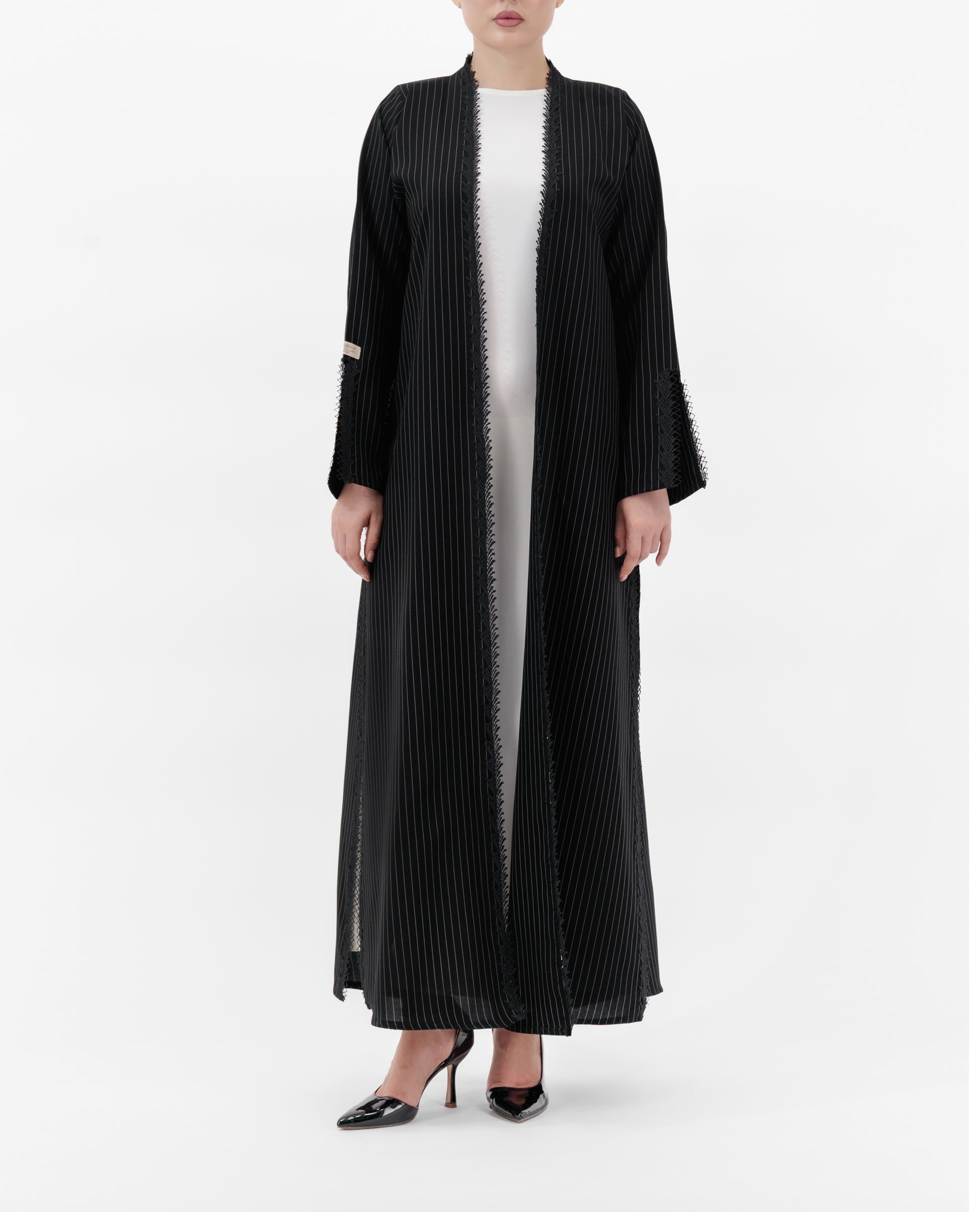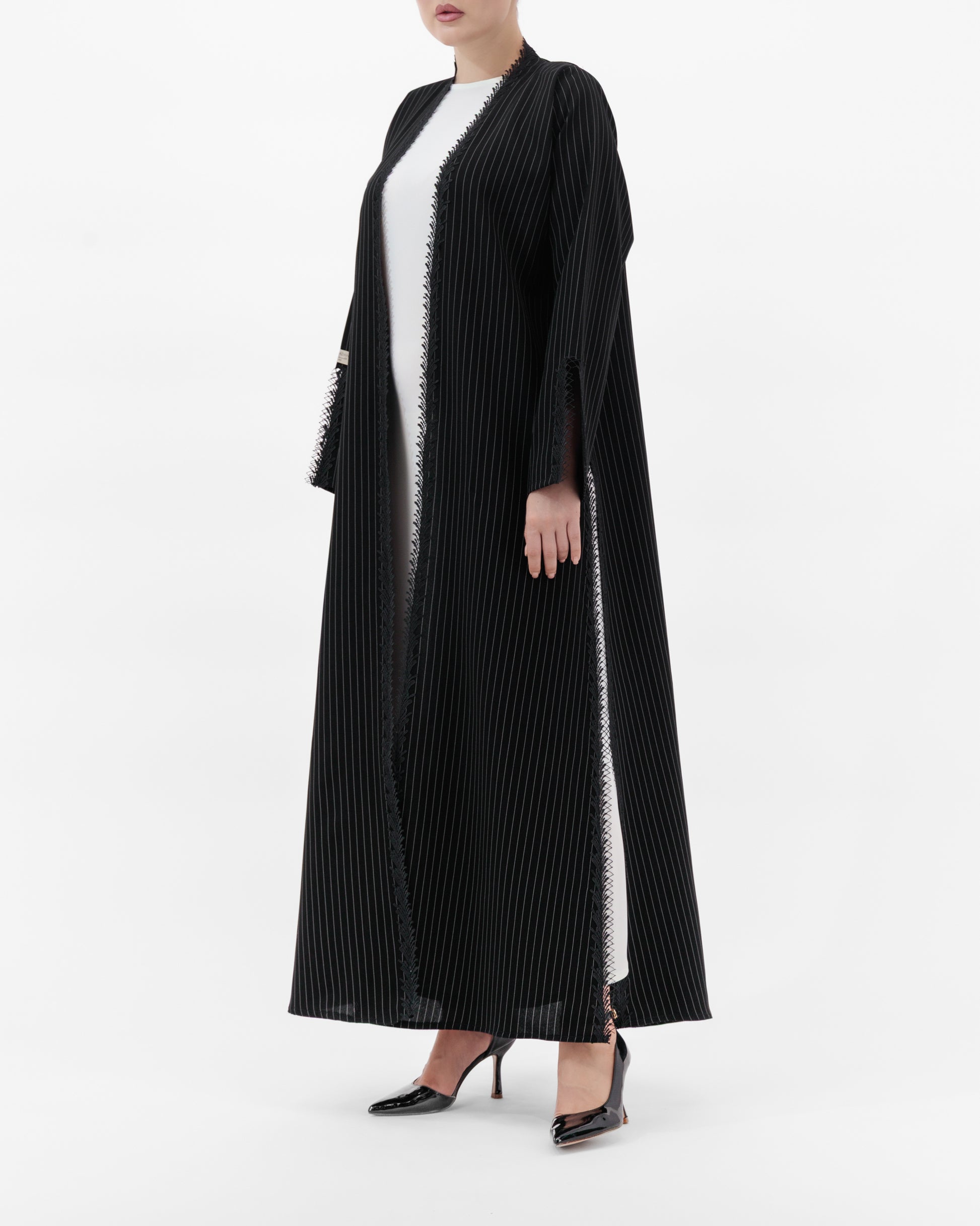 This design, named in honor of one of our cherished clients, is our way of celebrating timeless elegance and showing love through craftsmanship. Tailored in premium Italian crepe with fine pinstripes and finished with delicate lace-trim detailing, it reflects sophistication that every woman deserves to experience.