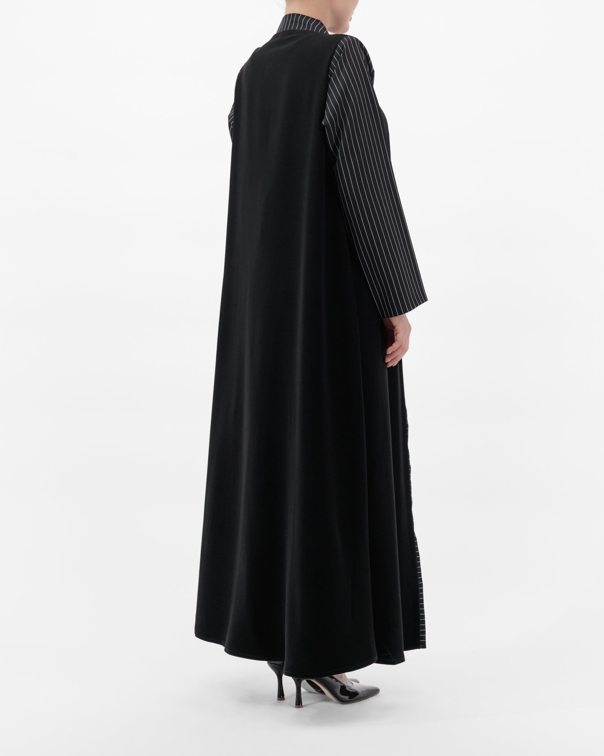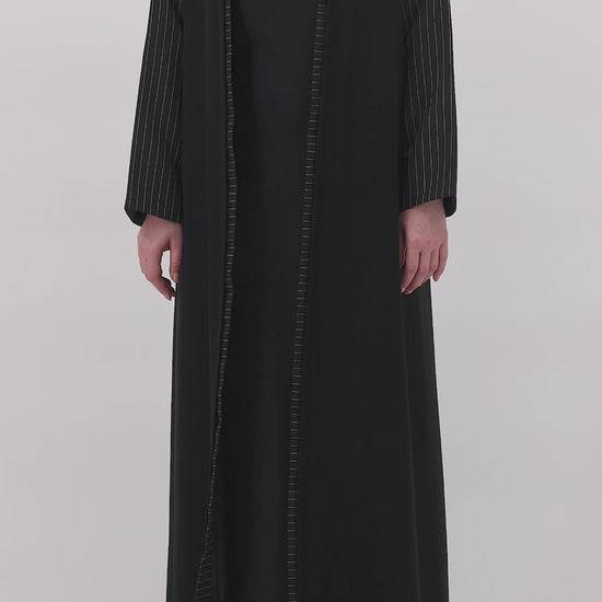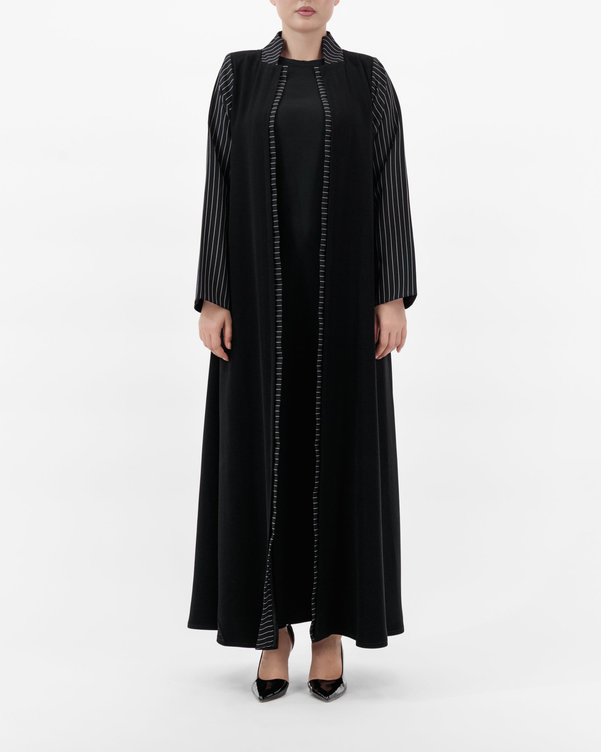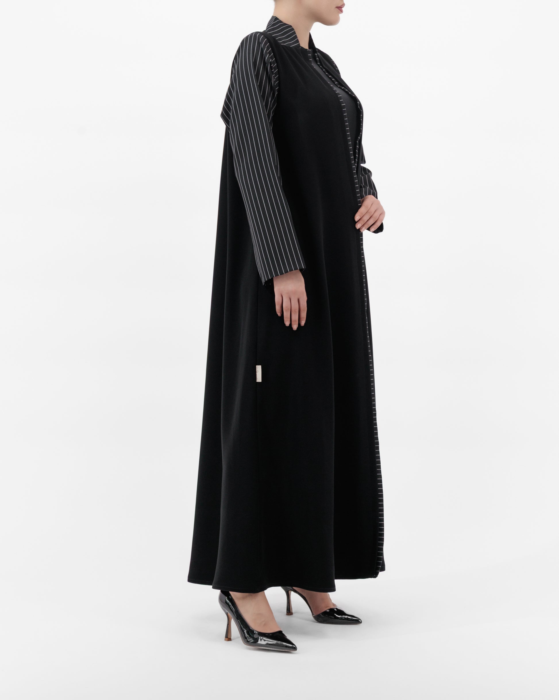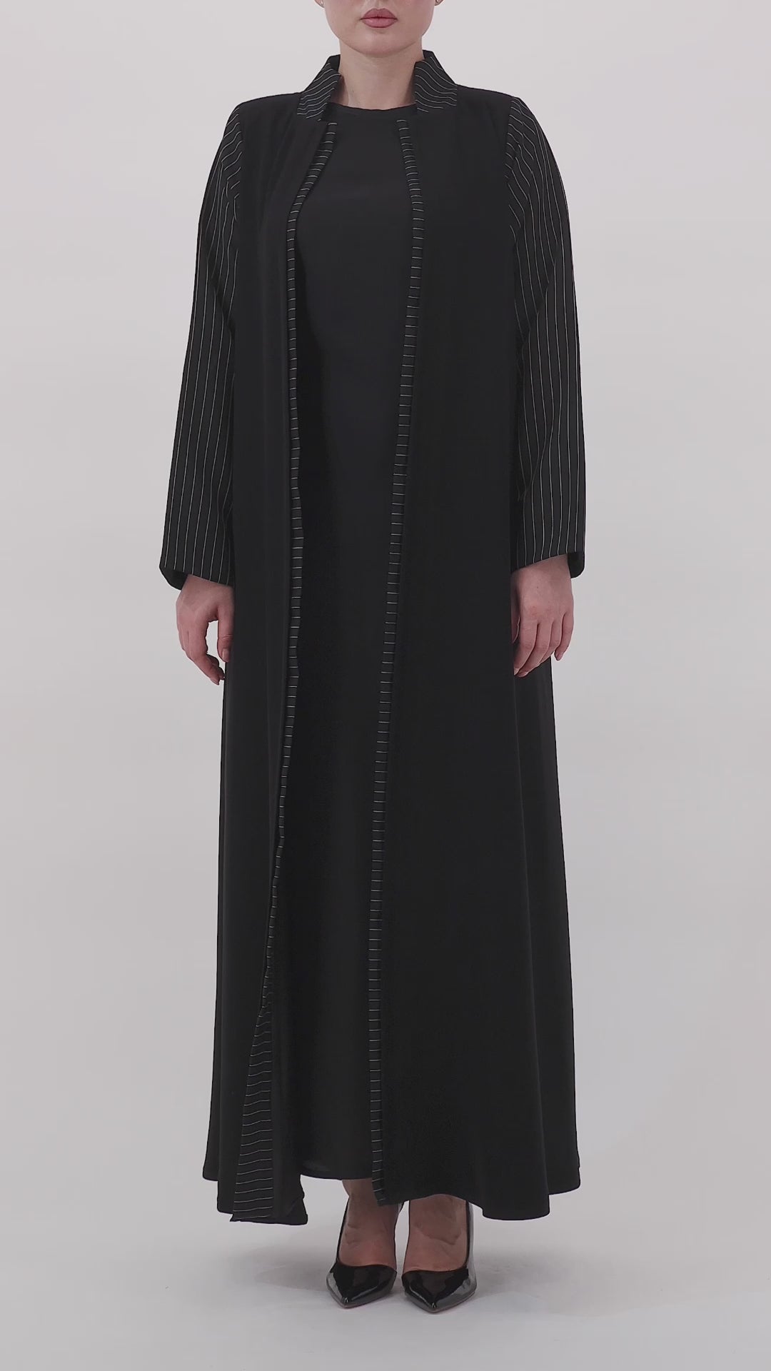 Made from luxurious Italian crepe, this abaya flows with elegance while keeping a lightweight, structured feel. The striped sleeves and collar add a modern, tailored twist, making it perfect for both professional and chic everyday wear.