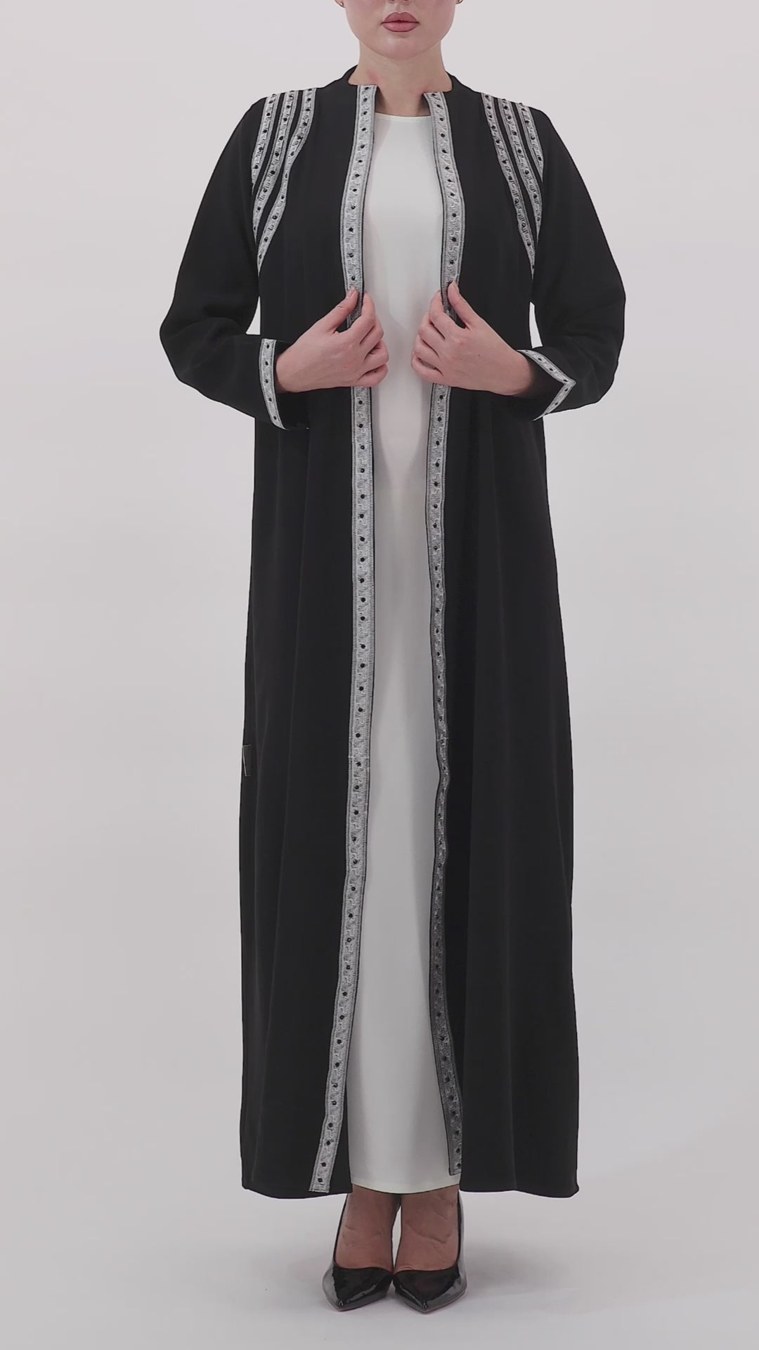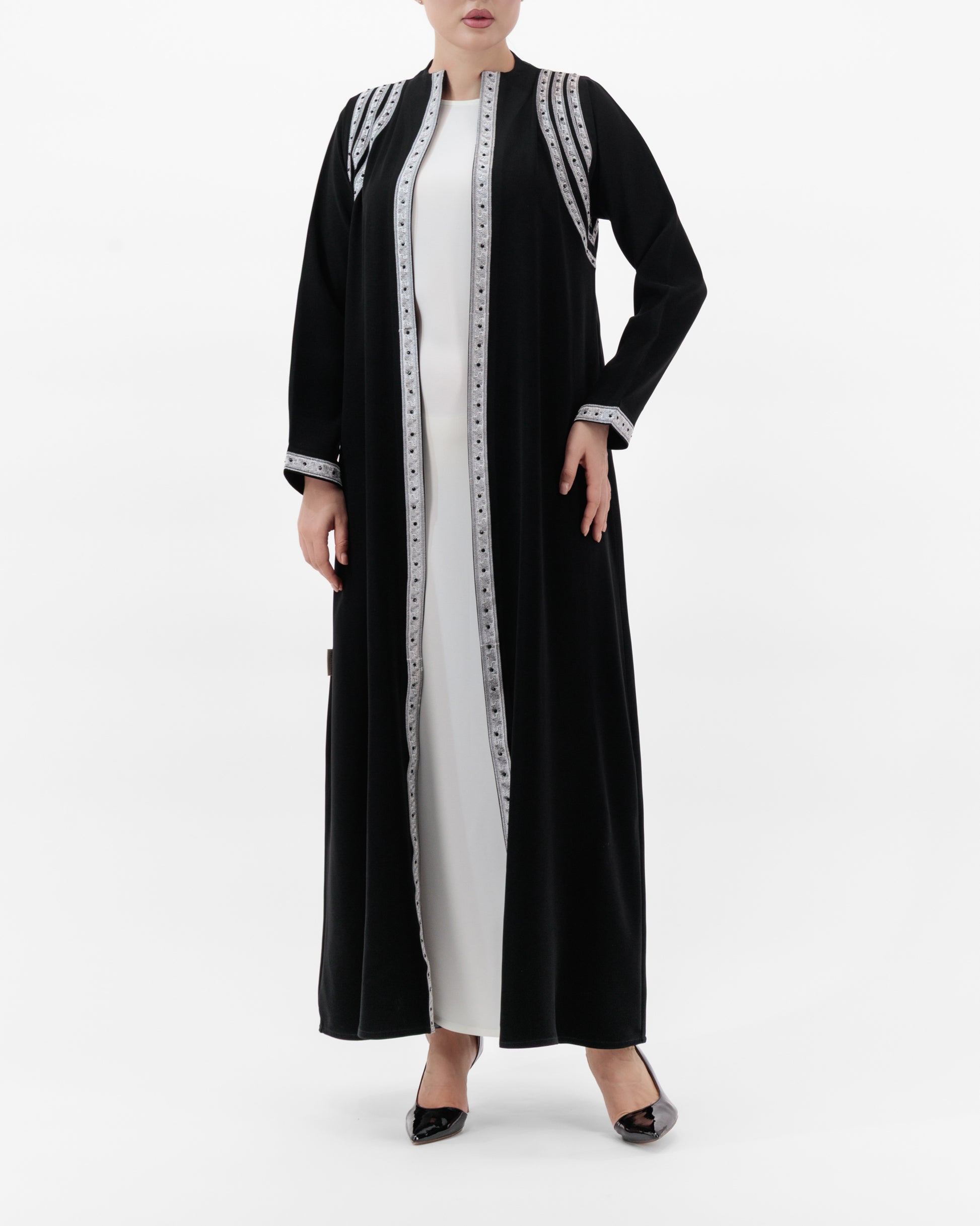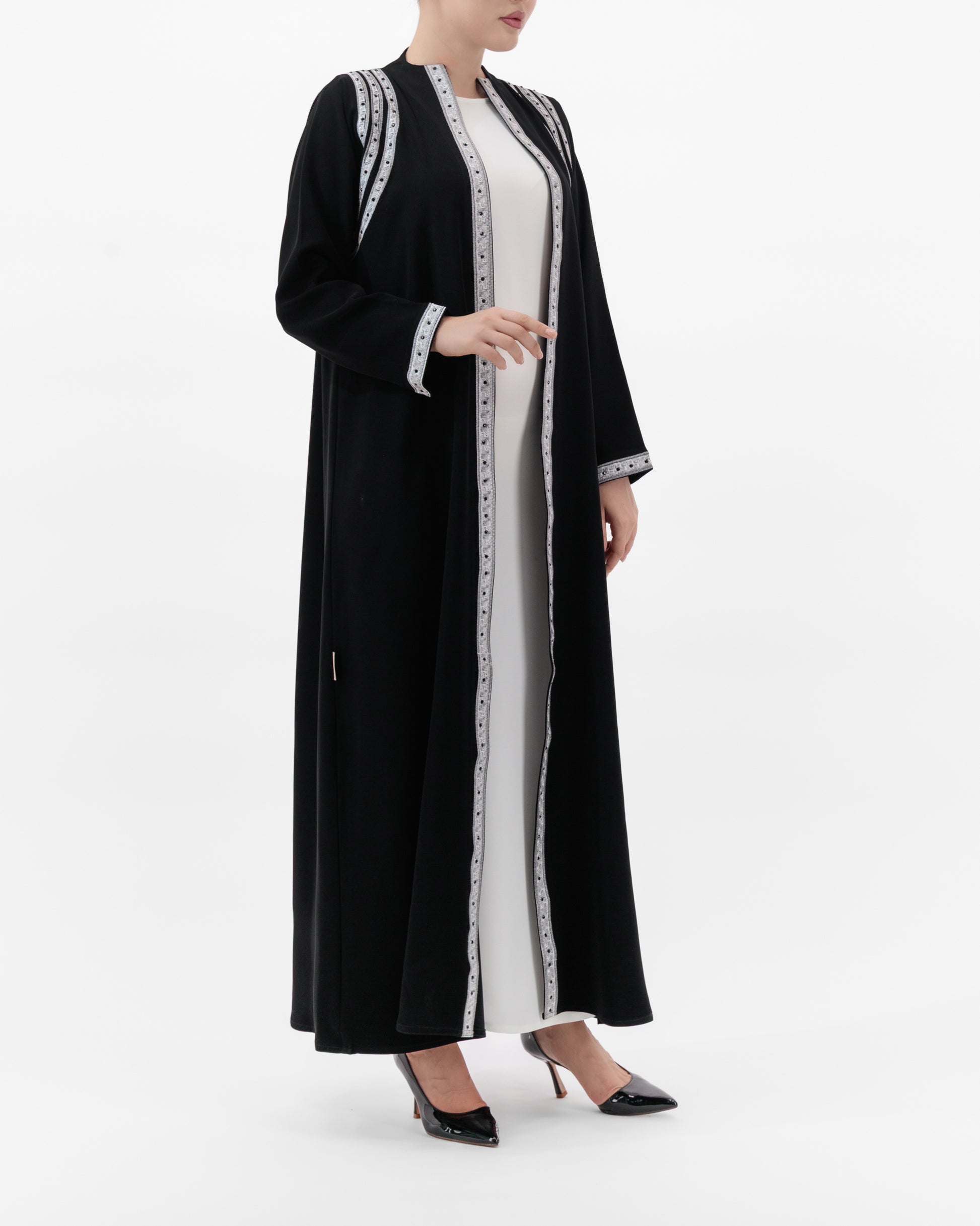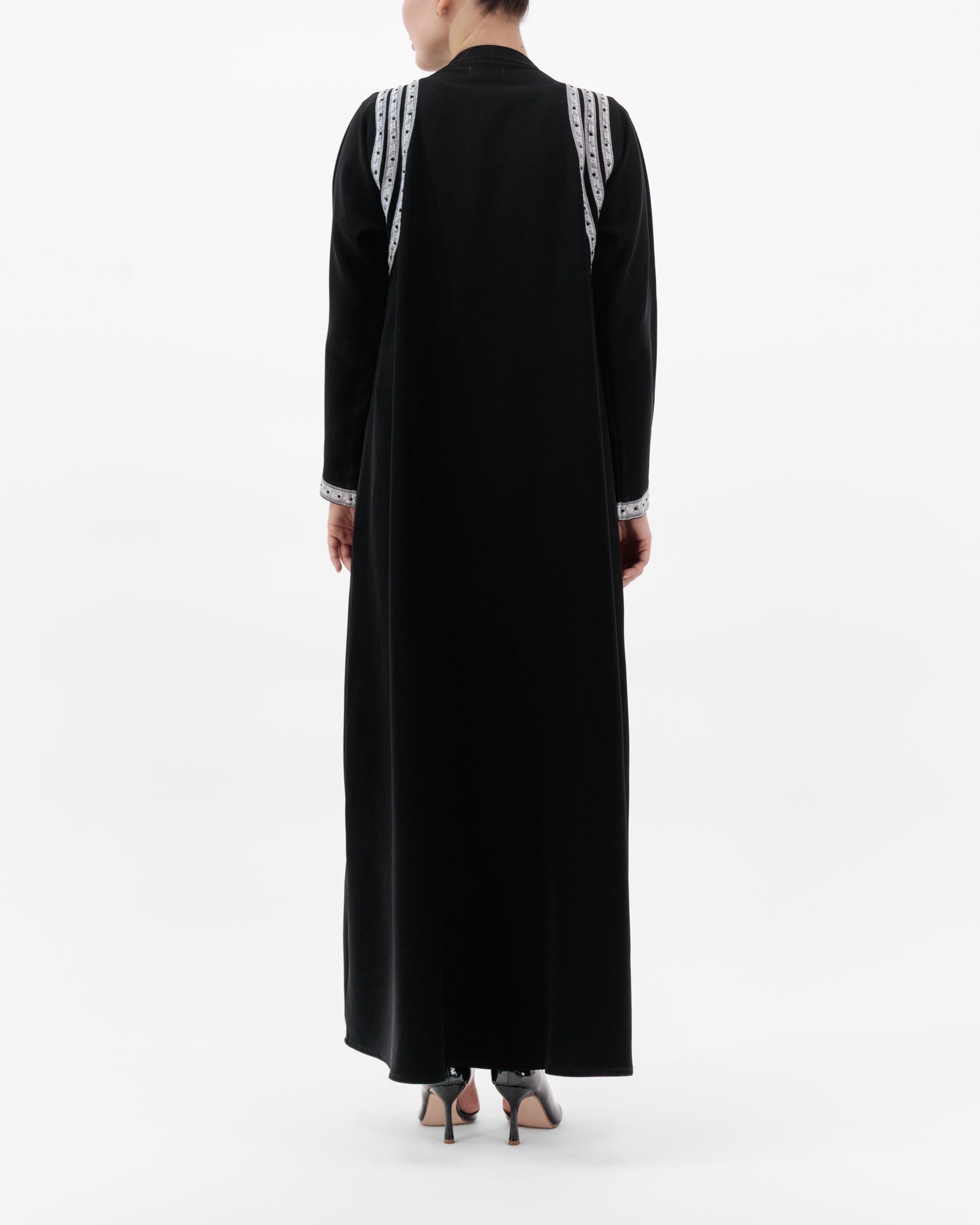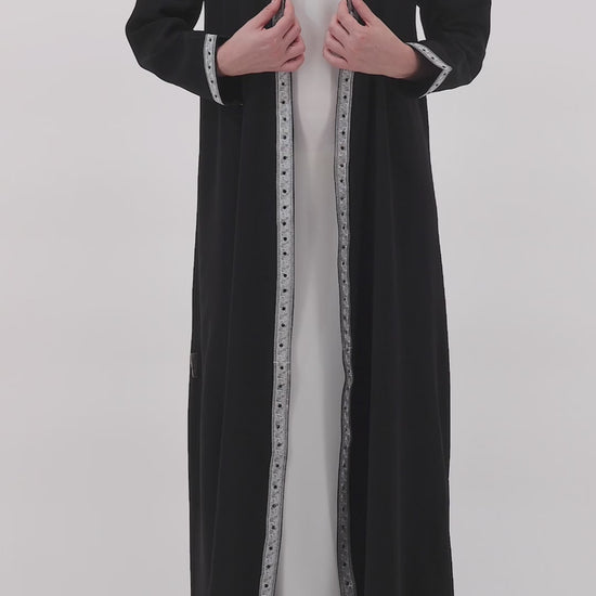 Crafted from premium Italian crepe, this abaya is elevated with silver embroidered trims that run along the front, shoulders, and cuffs. The intricate handwork adds depth and refinement, while the sharp contrast detailing creates a striking, regal presence. Lightweight yet structured, it drapes gracefully, offering timeless elegance for any occasion.