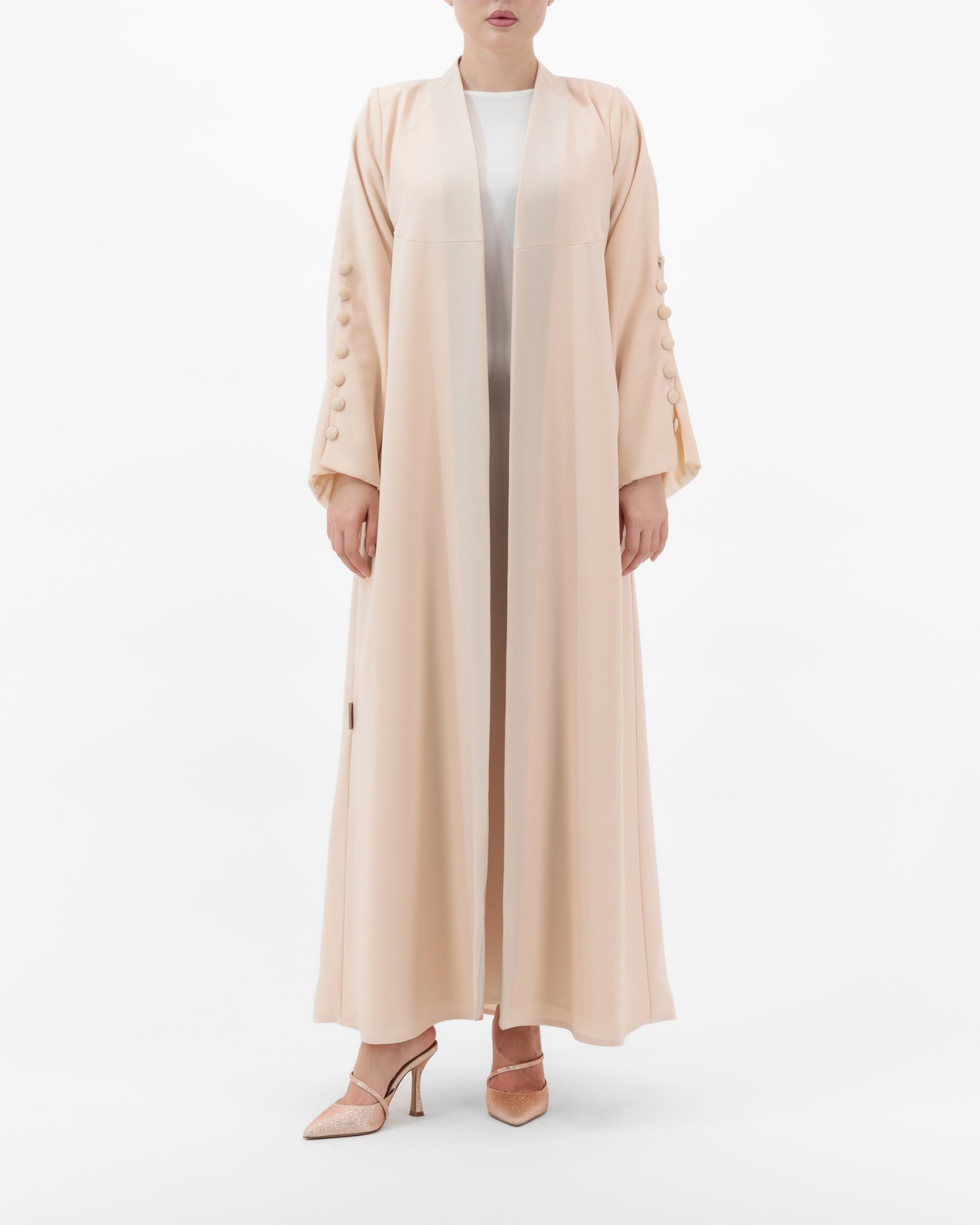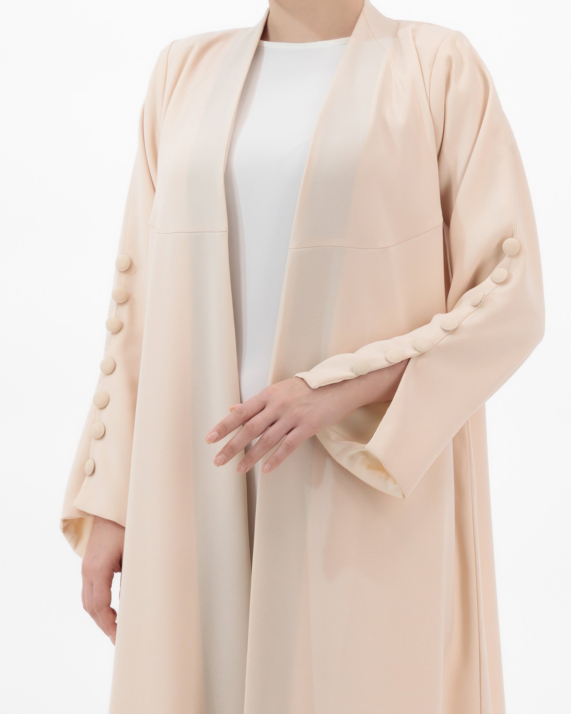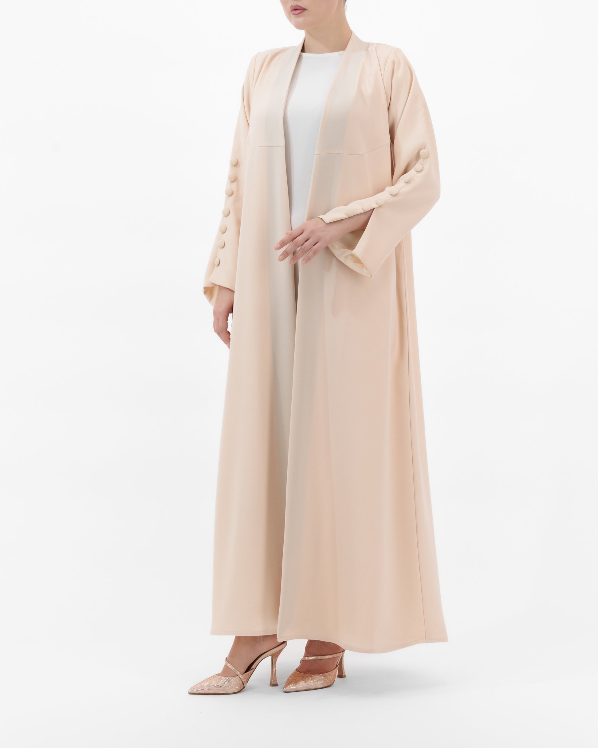 Crafted from premium silk crepe, this abaya is designed in a soft beige hue, detailed with fabric-covered buttons along the sleeves. Lightweight with a smooth drape, it blends elegance and minimal sophistication for a timeless look.