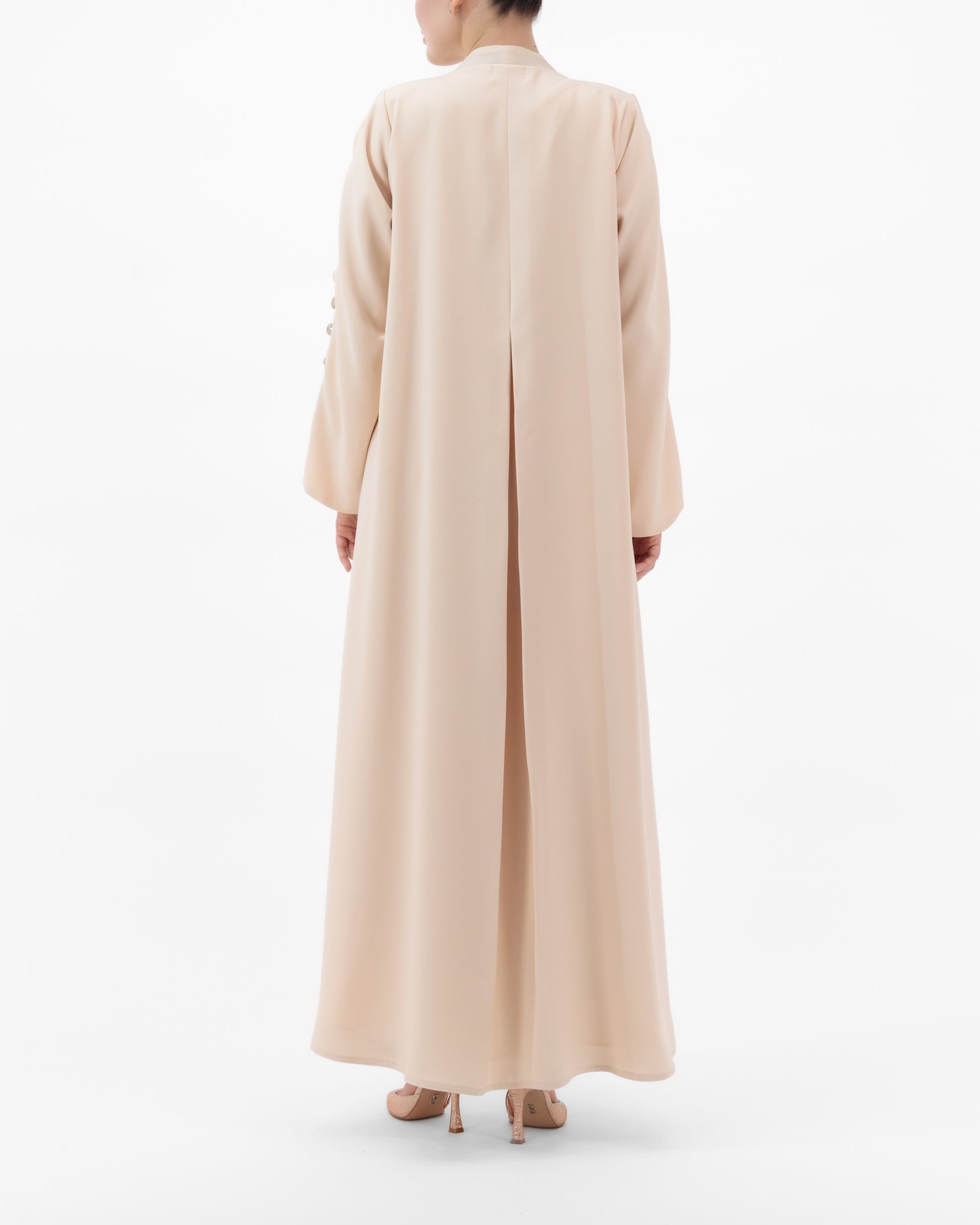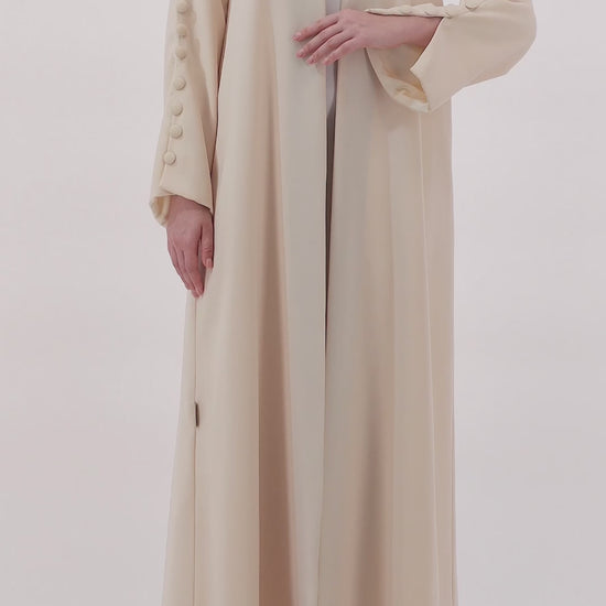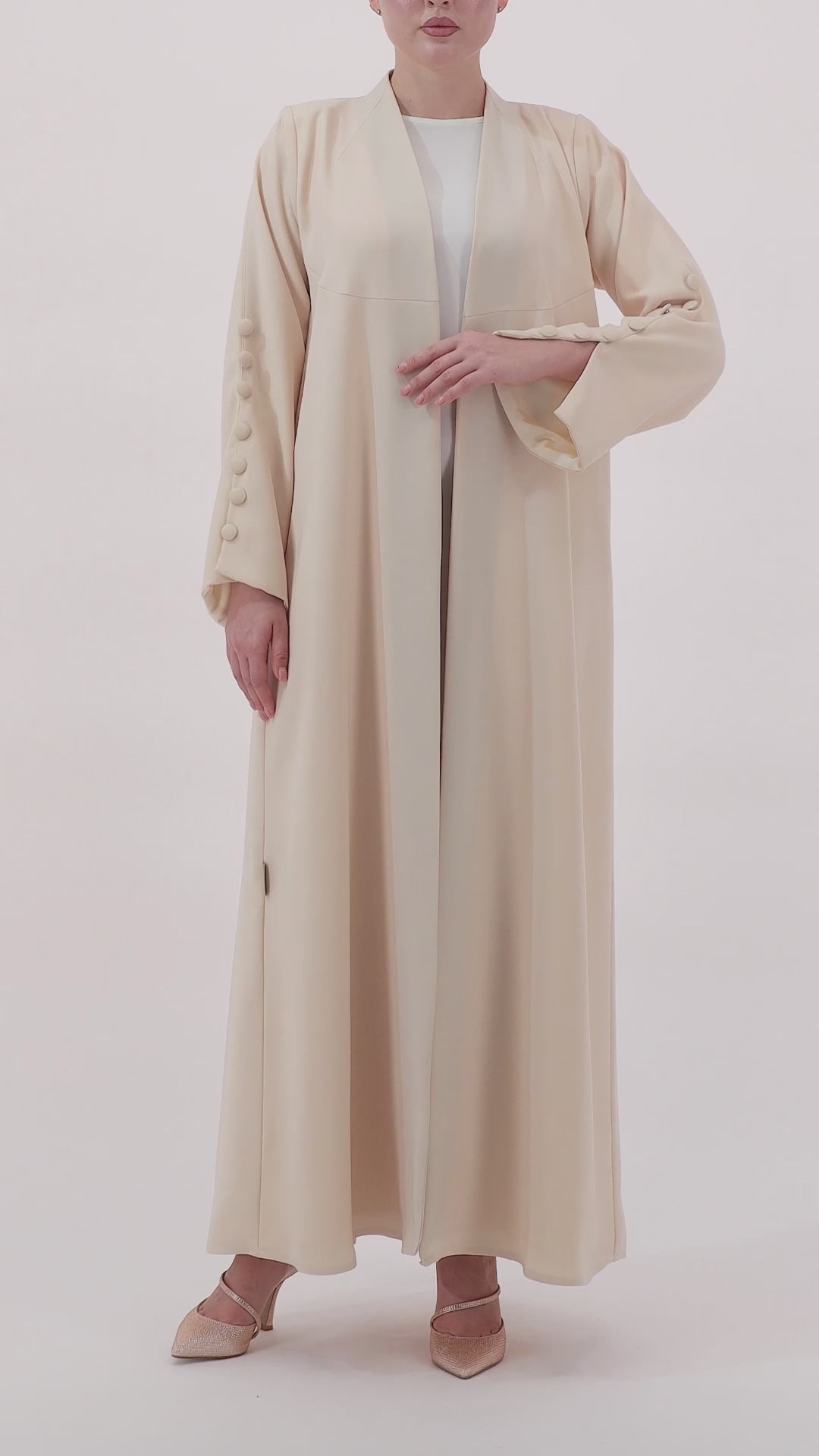 Crafted from premium silk crepe, this abaya is designed in a soft beige hue, detailed with fabric-covered buttons along the sleeves. Lightweight with a smooth drape, it blends elegance and minimal sophistication for a timeless look.