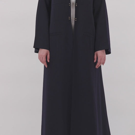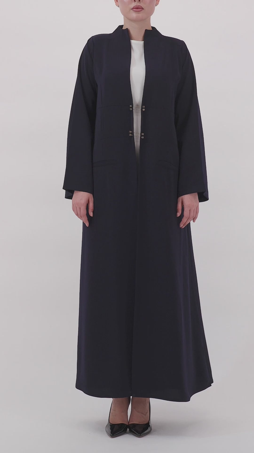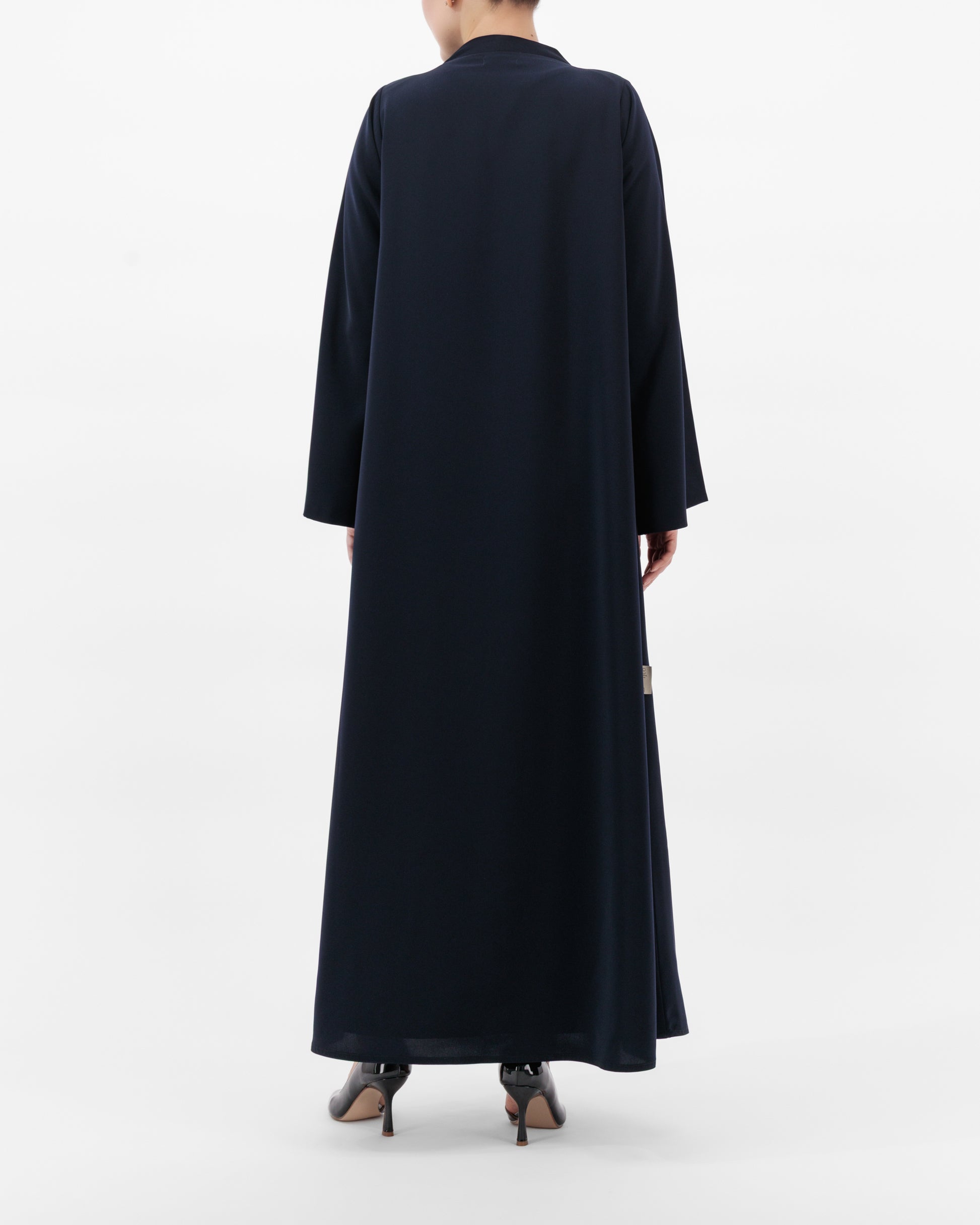 A timeless abaya tailored from premium crepe in a deep navy tone. Defined by sharp lines, structured form, and gold accent closures, it strikes the perfect balance between minimal elegance and powerful sophistication. Designed for the woman who values quiet luxury and refined detail.