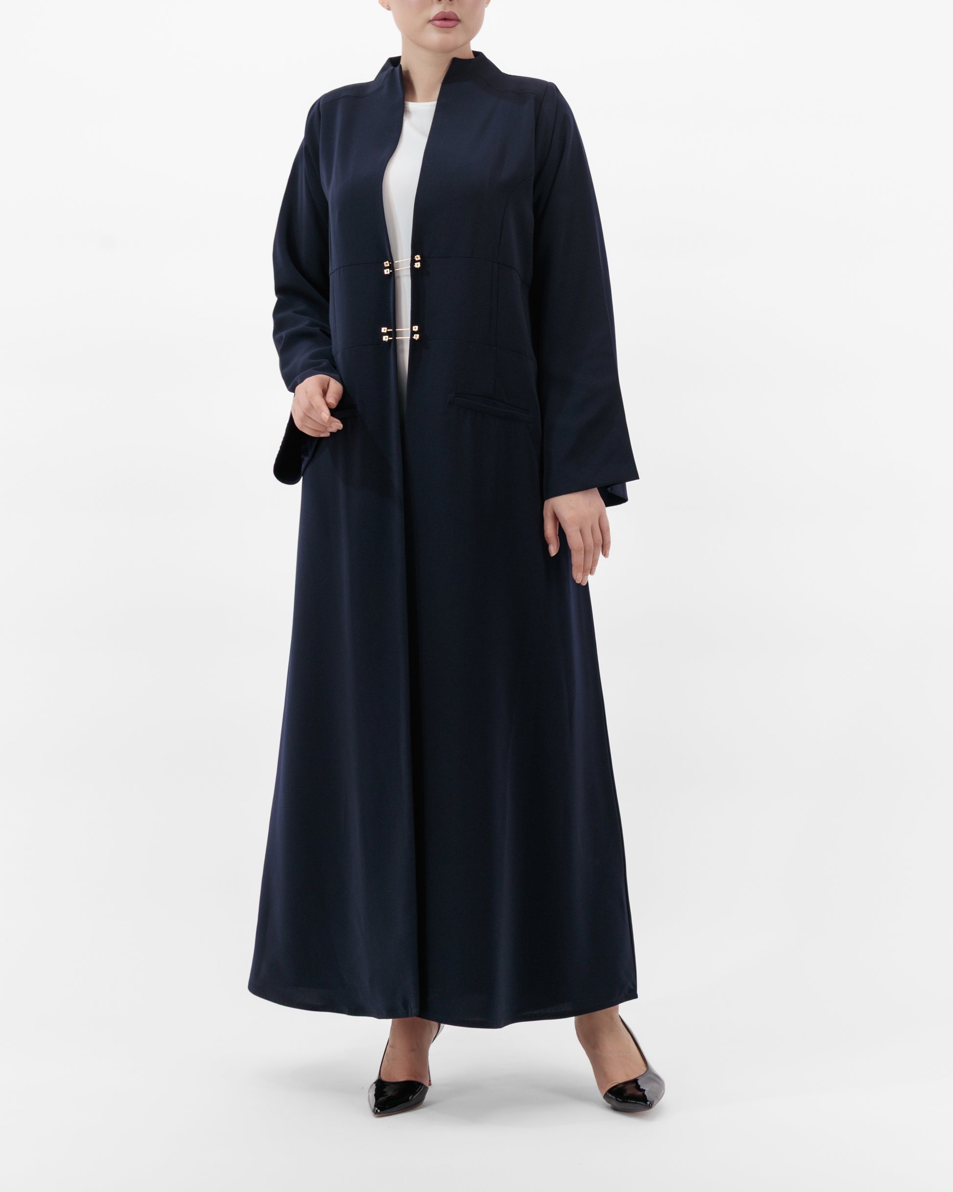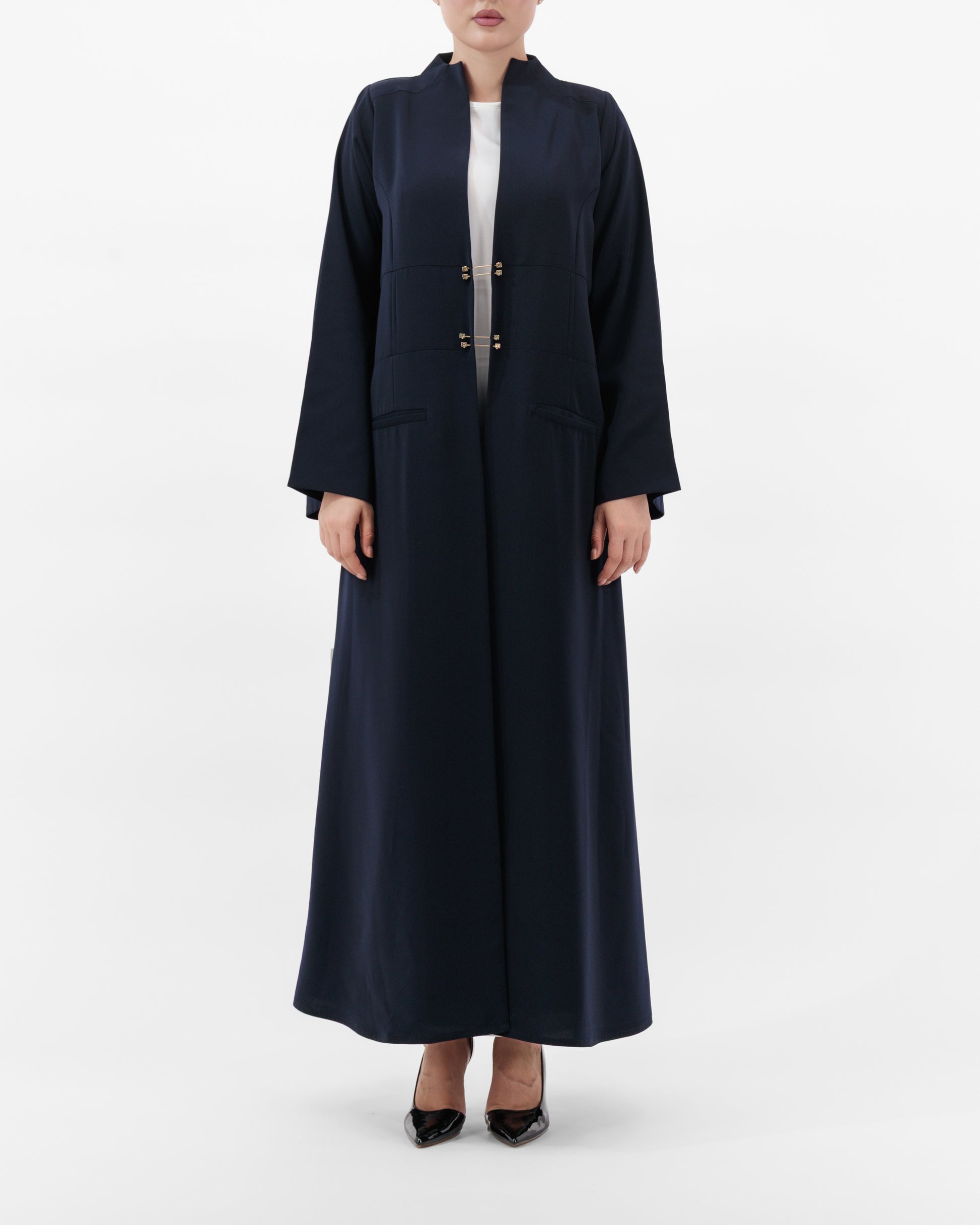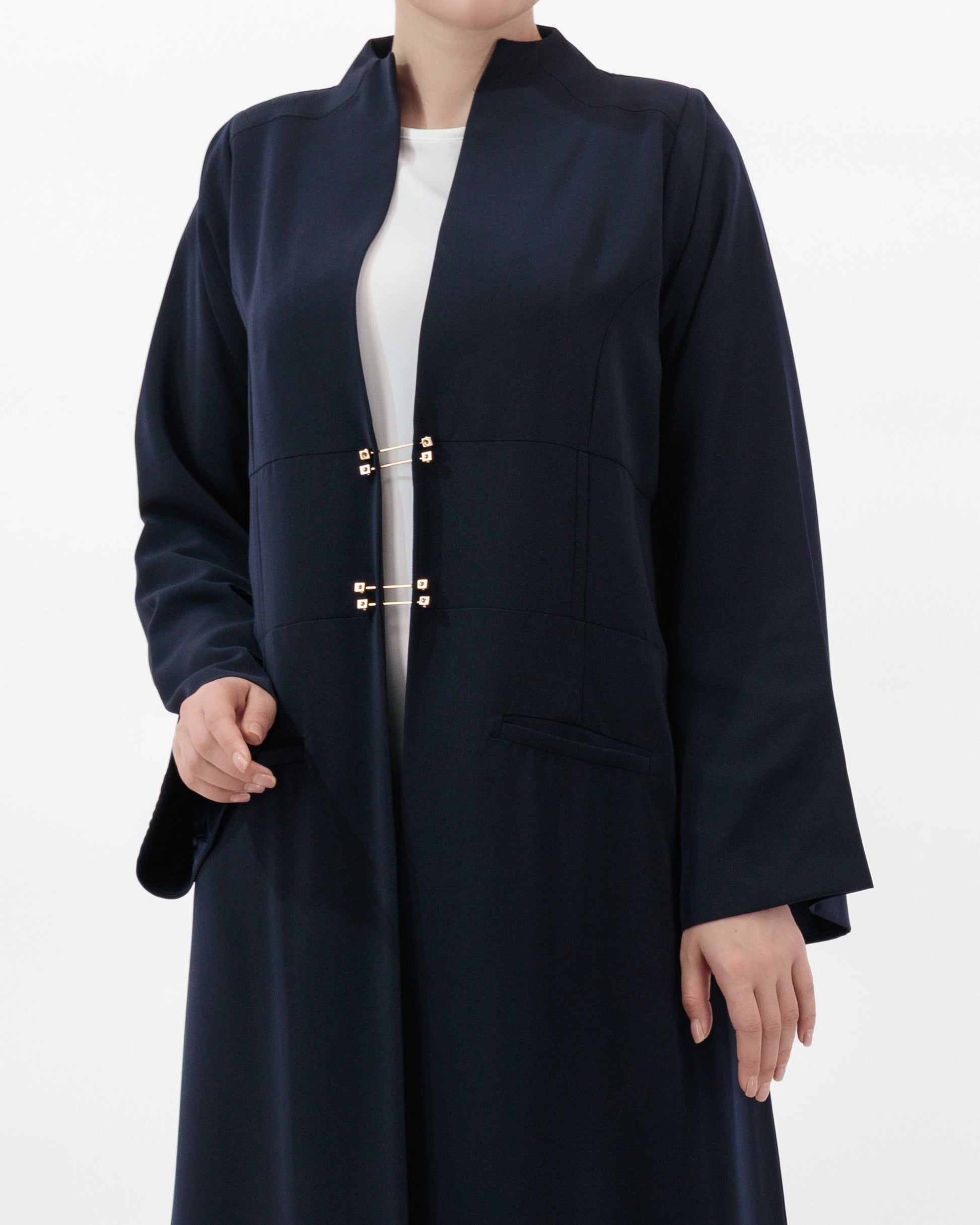 A timeless abaya tailored from premium crepe in a deep navy tone. Defined by sharp lines, structured form, and gold accent closures, it strikes the perfect balance between minimal elegance and powerful sophistication. Designed for the woman who values quiet luxury and refined detail.